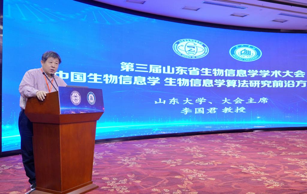 李国君致辞。他指出,本次大会不仅是一场学术盛宴,更是一次思想碰撞与合作共赢的契机。下一步,将开展多种形式的交流和合作,为生物信息学发展贡献智慧和力量。希望各位专家学者能持续关注山东生物信息学会的发展,通过资源共享、联合攻关,为山东乃至全国的生物信息学事业注入新动能。