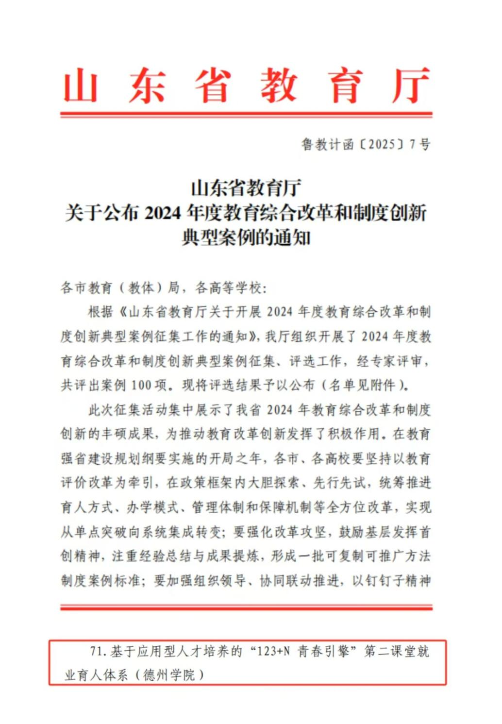 日前,山东省教育厅公布2024年度教育综合改革和制度创新典型案例,Beat365官网推送的《基于应用型人才培养的“123+N 青春引擎”第二课堂就业育人体系》成功入选。