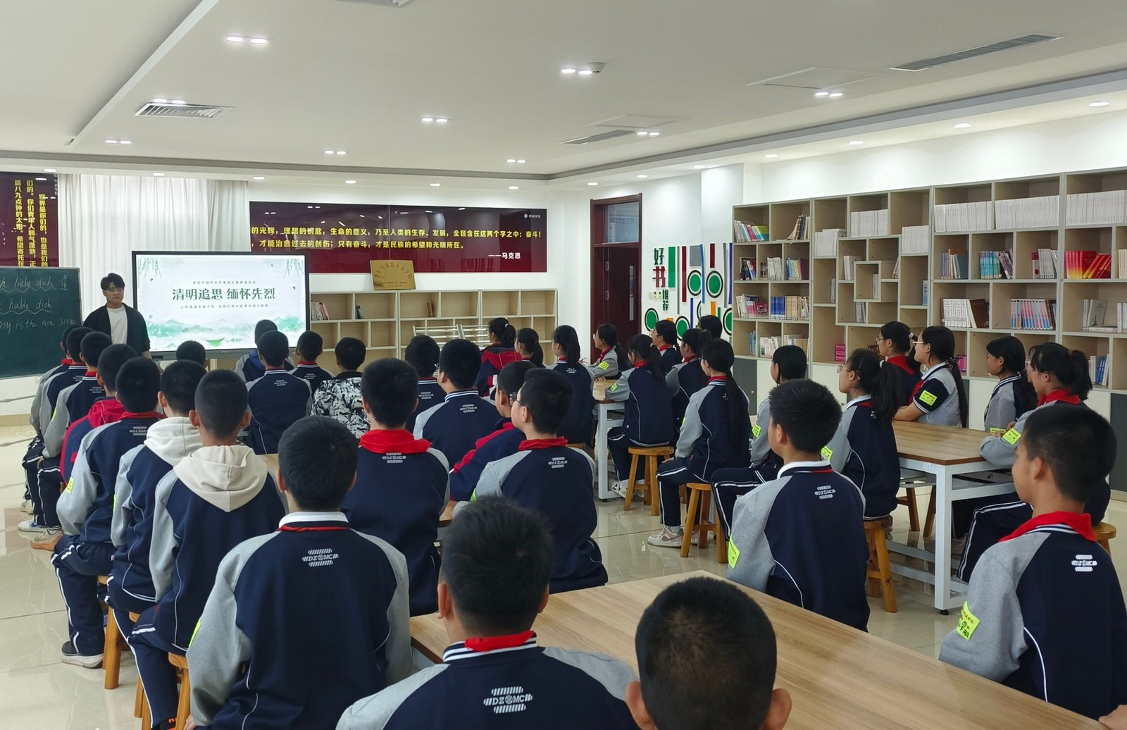沙王小学的课堂上,大学生与红领巾们携手举办“诗乐清明祭,赤忱青年志”古今对话诗会。清明经典诵读展演中,《清明》童声吟诵与大学生原创诗词交响共鸣;诗词创作工坊里,孩子们用"英雄碑前花,年年寄春思"的稚嫩诗句回应历史,这场跨越代际的文化共建,不仅构建起大中小学思政教育一体化实践范式,更让传统文化在创造性转化与创新性发展中迸发新活力。正如文学与历史学院团委书记张亮所言:“当孩子们用稚嫩笔触写下‘英雄花开时,山河已无恙’,文化传承便有了最生动的注脚。”