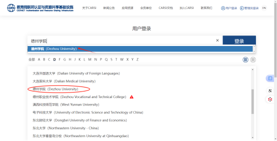 4.进入CARSI门户资源清单页面,在“本校可用资源”中选择或者在搜索框中输入需要的数据库资源。