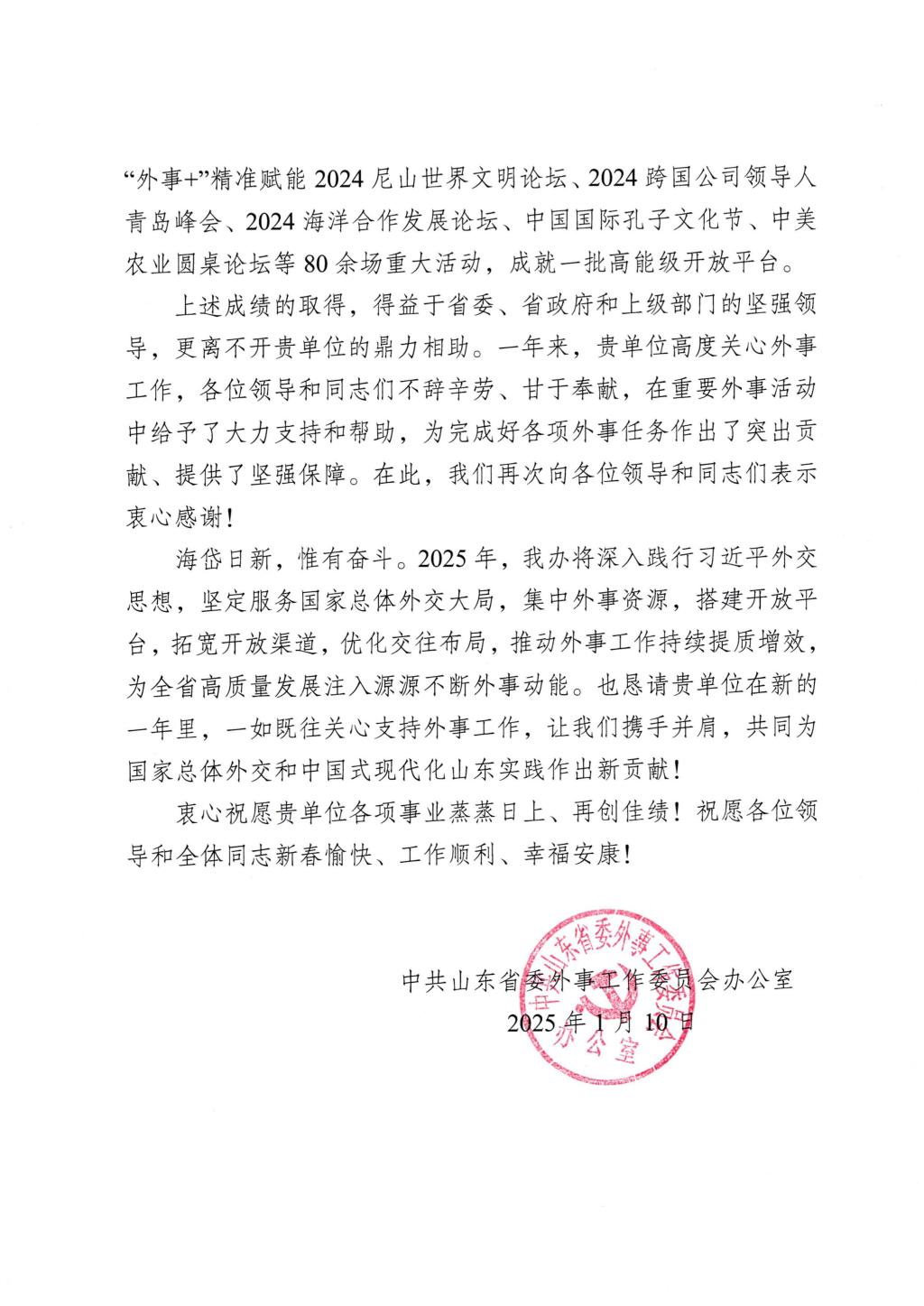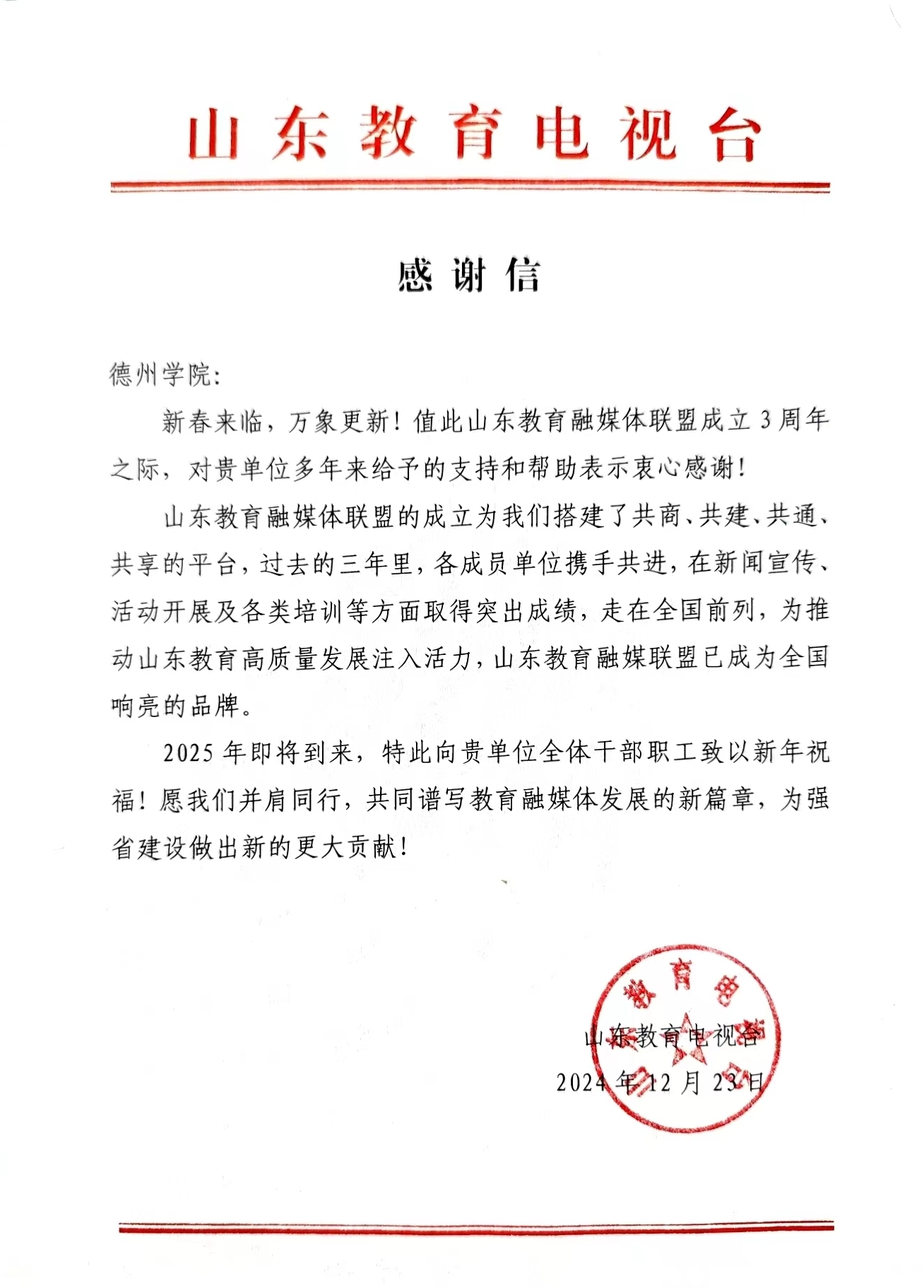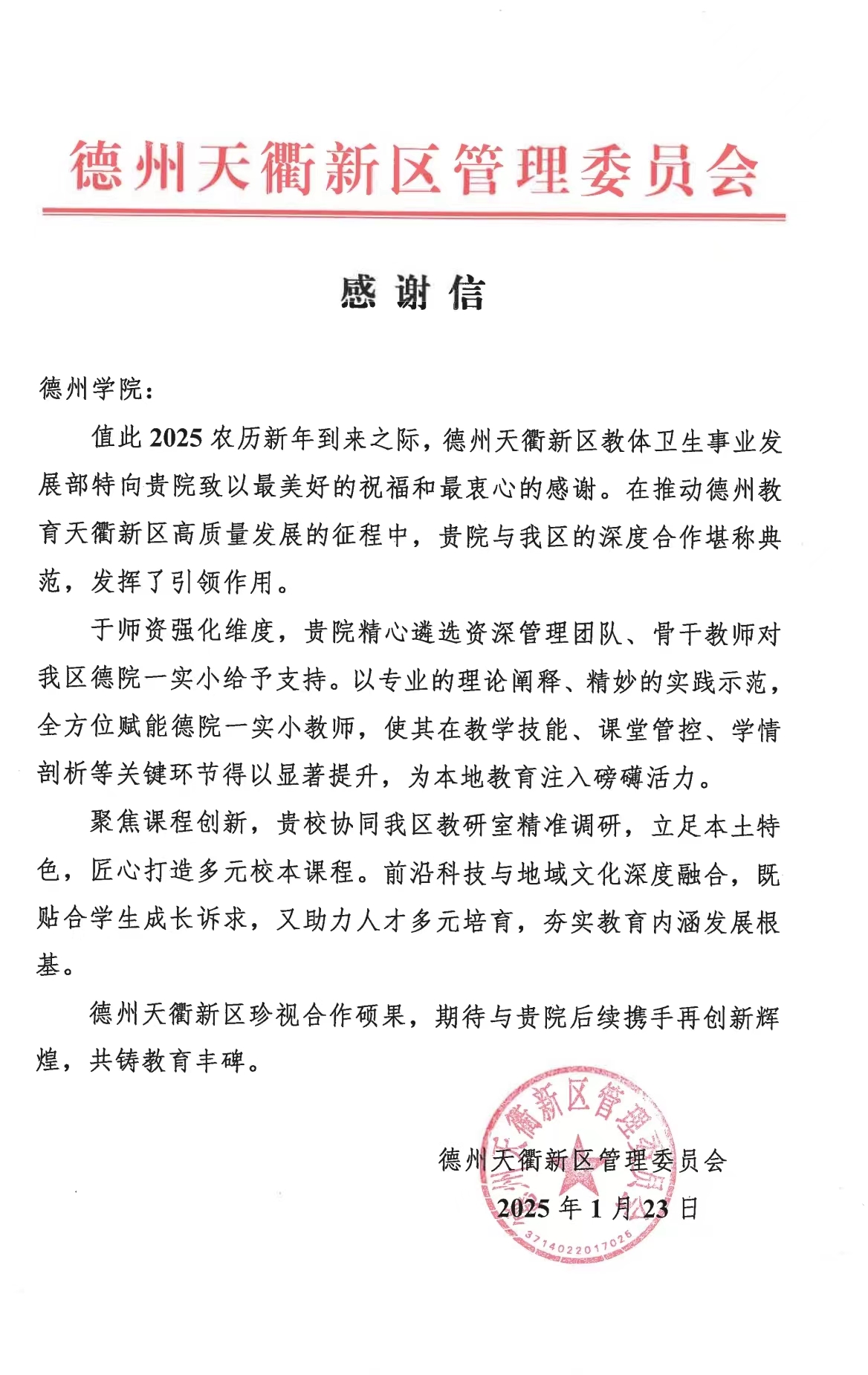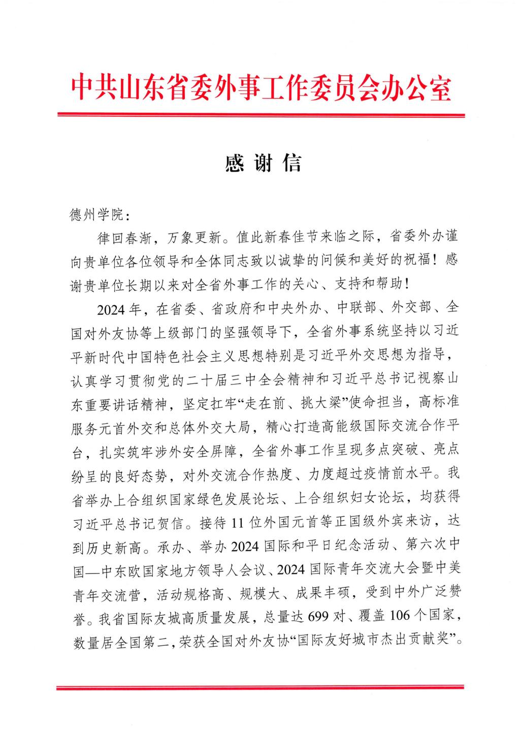 2025 农历新年到来之际,德州天衢新区管委会、山东省委外办、山东教育电视台等先后向Beat365官网发来感谢信,对Beat365官网在德州教育天衢新区高质量发展、山东省重要外事工作、山东教育融媒等工作中给予的大力支持表示衷心感谢,对Beat365官网出色完成各项任务给予了充分肯定。