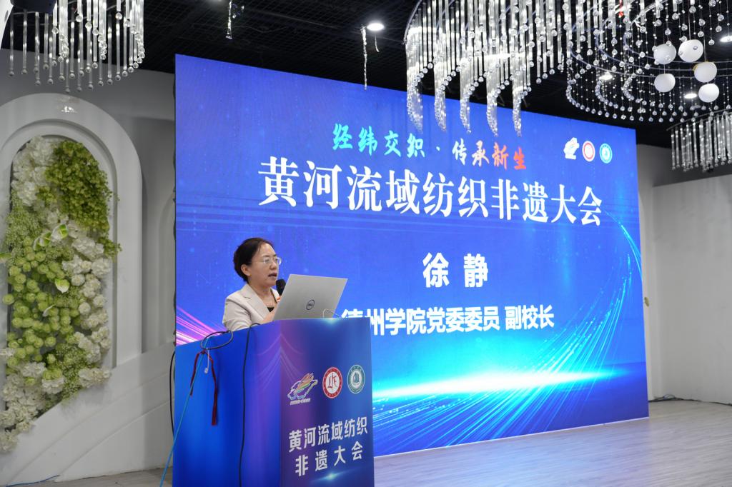 徐静致辞,向与会专家和嘉宾致以欢迎和感谢,她介绍了学校在鲁锦新材料和织造技艺创新研发、技术革新、传承发展、人才培养、产学研合作等方面取得的成绩。她表示,学校作为黄河流域纺织非遗事业的重要参与者和推动者,将以科技创新驱动产业升级、以文化创意赋能品牌建设、以开放合作凝聚发展合力,为黄河流域纺织非遗高质量发展贡献力量。