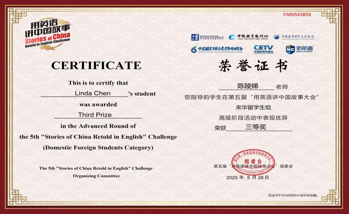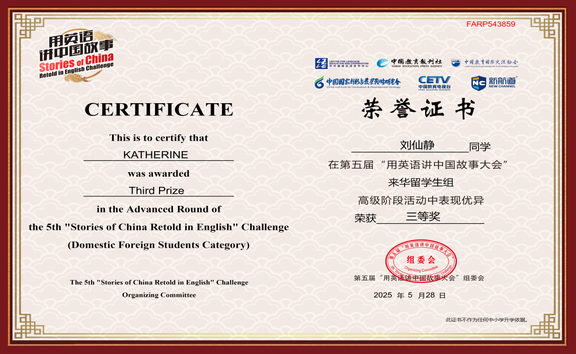 5月30日,Beat365官网来自印度尼西亚的刘仙静同学在第五届“用英语讲好中国故事”大会来华留学生组高级阶段活动中表现优异,荣获省级三等奖。此次比赛由中外语言交流合作中心、中国教育报刊社等单位指导,中国国家创新与发展战略研究会、中国教育电视台等机构联合主办,旨在推动中华文化国际传播,展现新时代中国形象。刘仙静同学在陈陵娣老师的悉心指导下,凭借出色的英语表达能力和对中国文化的深刻理解,在线上决赛中脱颖而出,最终斩获佳绩。