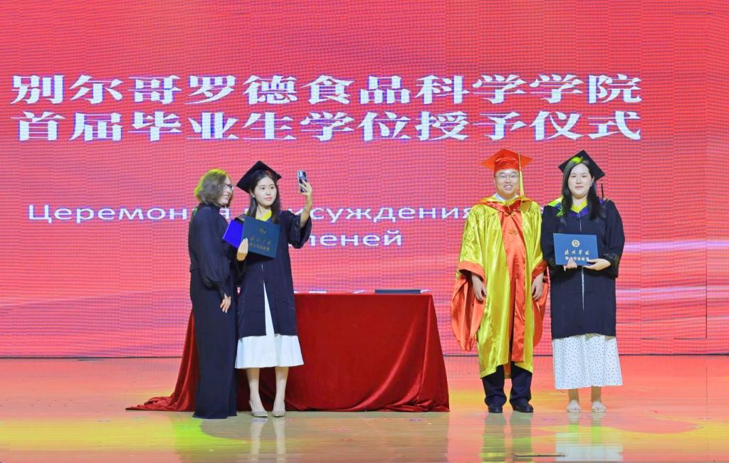 在学位授予仪式环节,别尔哥罗德食品科学学院执行院长王丽燕宣读《关于授予别尔哥罗德食品科学学院111名本科毕业生学士学位的决定》。赵长林与卡尔洛夫斯卡娅·叶甫盖尼娅为毕业生拨穗正冠,授予学位,握手祝贺并合影留念。