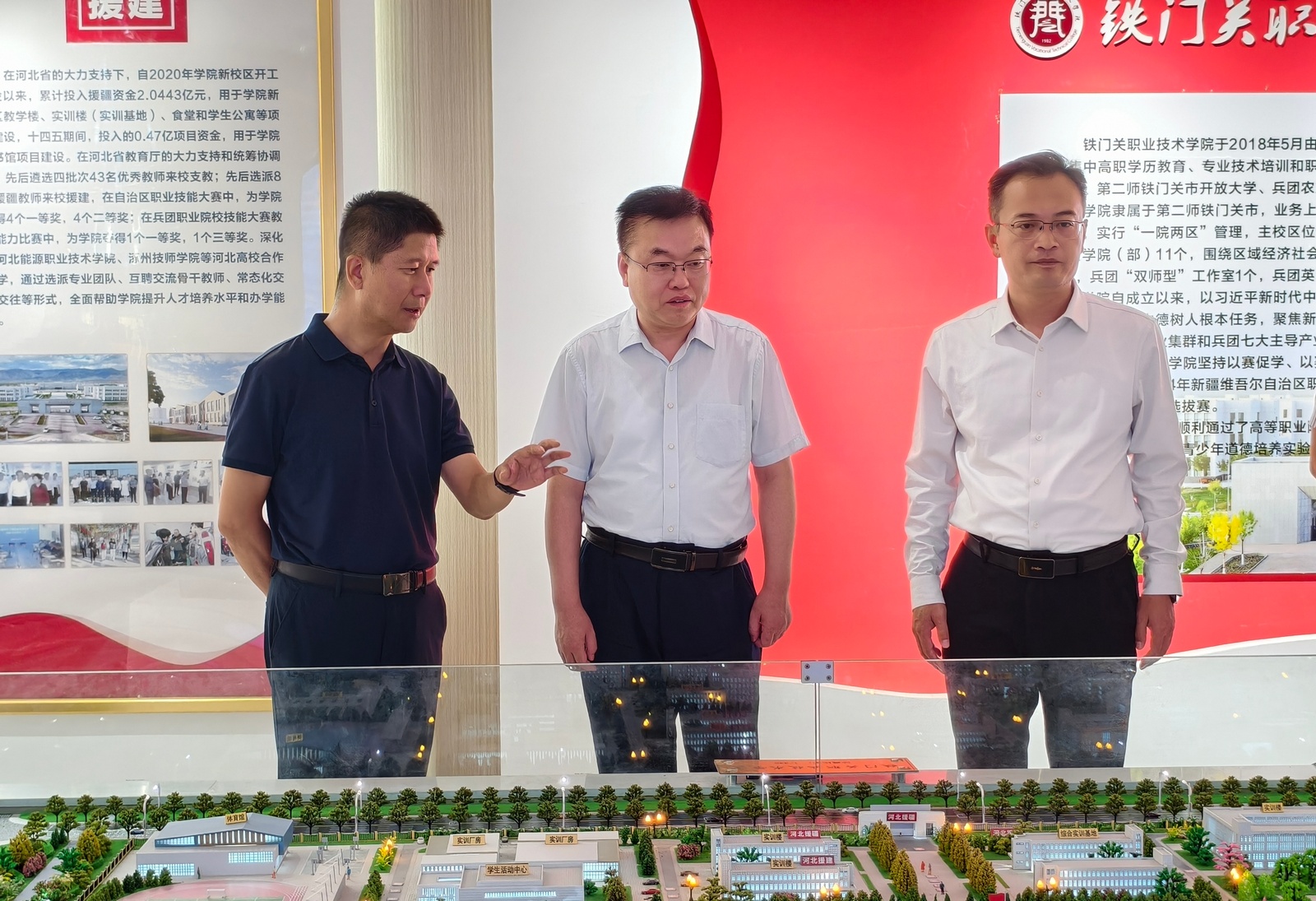 在铁门关职业技术学院,赵长林一行参观了学校教育艺术学院、实习实训场所和产业学院展厅。铁门关职业技术学院党委副书记、院长苏强对赵长林一行表示热烈欢迎,详细介绍了学校办学历史、基本情况和发展规划。赵长林对铁门关职业技术学院各项事业发展取得的成绩表示赞赏,并介绍了学校发展情况和在人才培养、学科学位点建设、国际化办学、西部计划项目等方面的工作进展。他强调,德州市和铁门关市是山东军区渤海教导旅的出发地和扎根地,有着一脉同源的红色血脉,希望两校能以此次交流为契机,共同赓续红色基因,加强校际互鉴合作、携手并进,在推动两校事业高质量发展,加强志愿服务、渤海教导旅红色文化传承创新、银龄学者、专业实习、社会实践、科技成果转移转化等方面的项目合作,携手践行“依法治疆、团结稳疆、文化润疆、富民兴疆、长期建疆”新时代党的治疆方略,共同塑造两校服务边疆建设新优势。