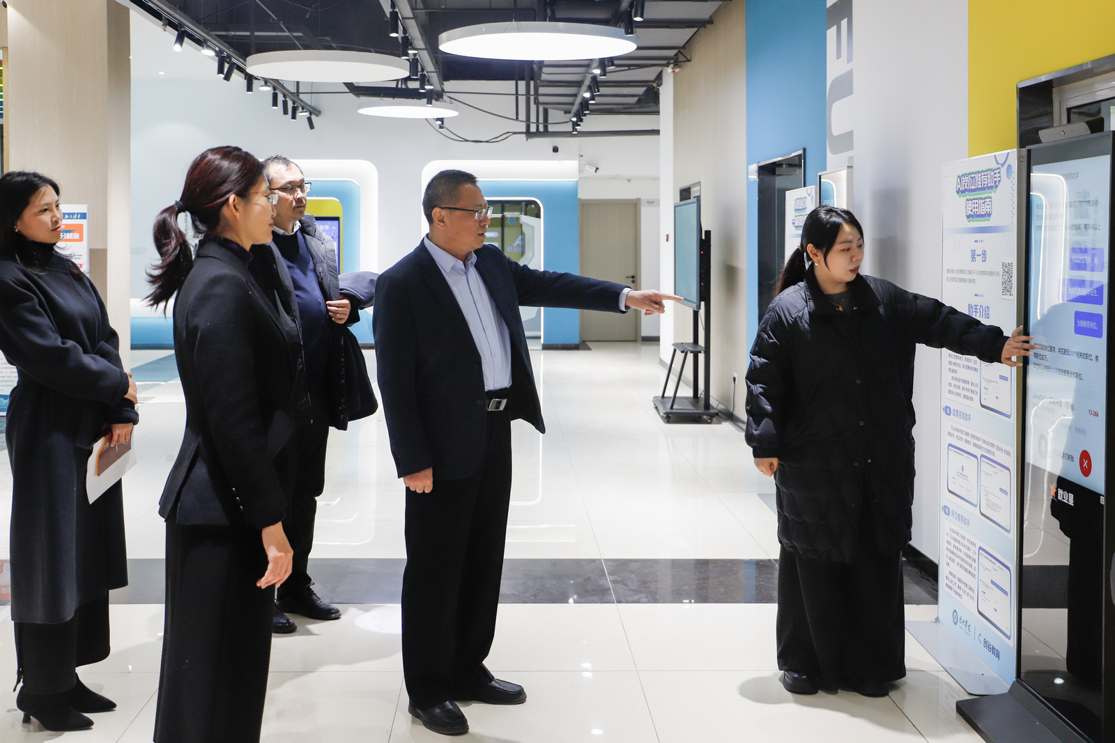 吴君实地走访赋能中心各功能区域,详细了解空间规划、设施运行、日常管理及服务开展情况。他重点询问数智就业平台数据监测、线上招聘活动效果以及AI模拟面试、简历优化等系统的学生使用反馈,并与在场咨询和体验的学生交流,听取他们的实际需求与意见建议。