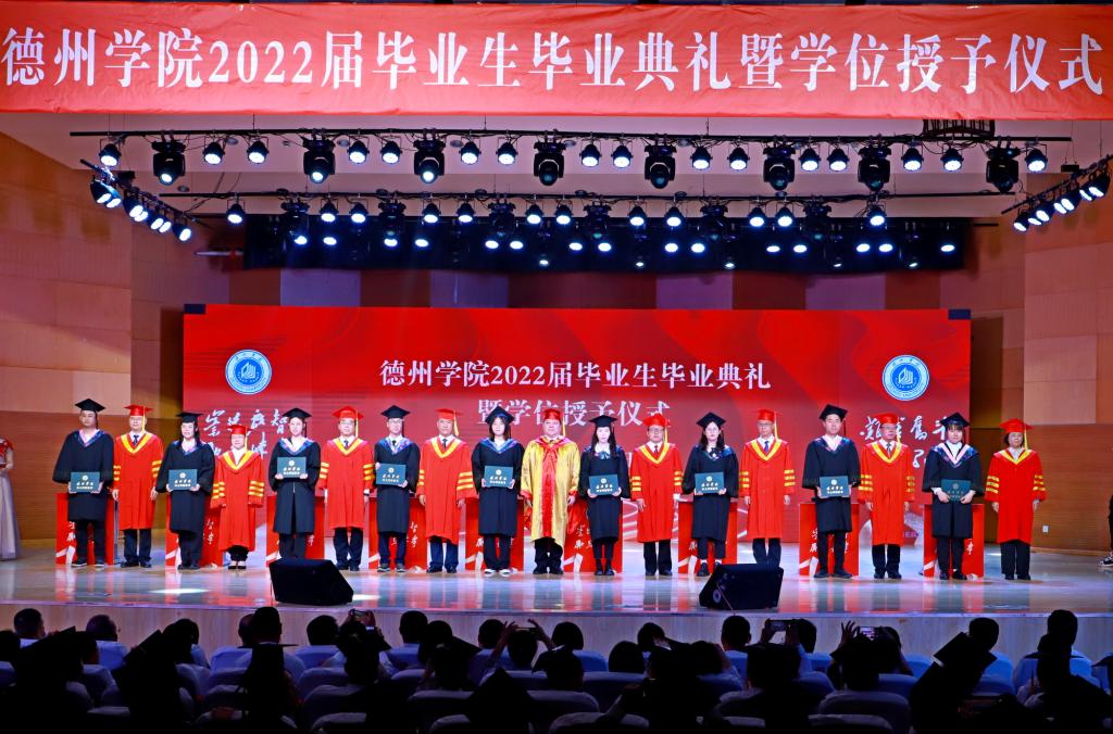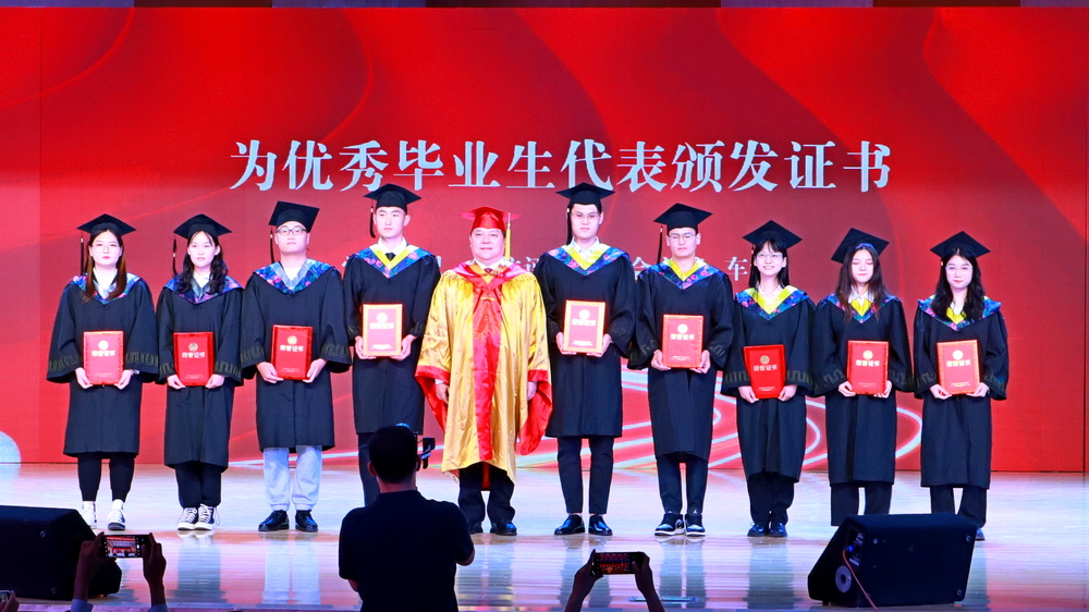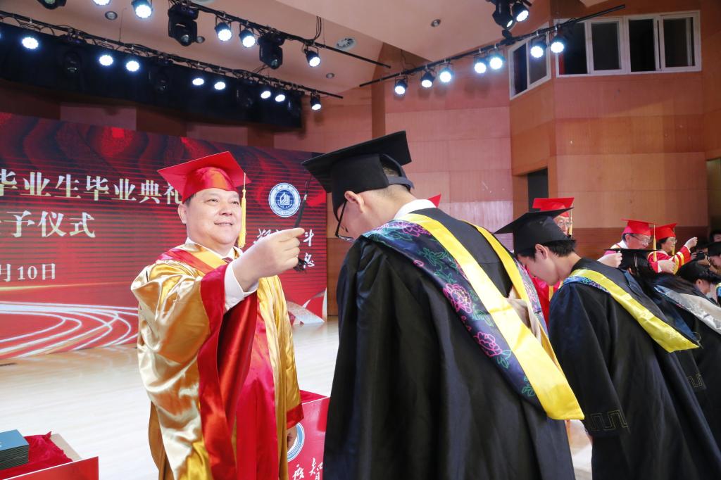 学位授予仪式上,校领导为毕业生代表逐一拨穗正冠,颁发学位证书并合影留念。