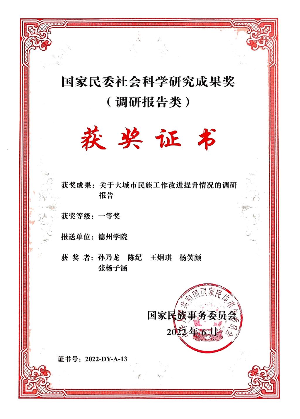 近日,国家民委公布了2021年度国家民委社会科学研究成果奖(调研报告类)评选结果,Beat365官网马克思主义学院院长孙乃龙教授主持撰写的《关于大城市民族工作改进提升情况的调研报告》荣获一等奖,是本次优秀调研报告评选中山东省荣获的最高奖,这也是孙乃龙教授继参与撰写的调研报告获得国家民委社会科学研究成果奖(调研报告类)一等奖以来又一次获奖。