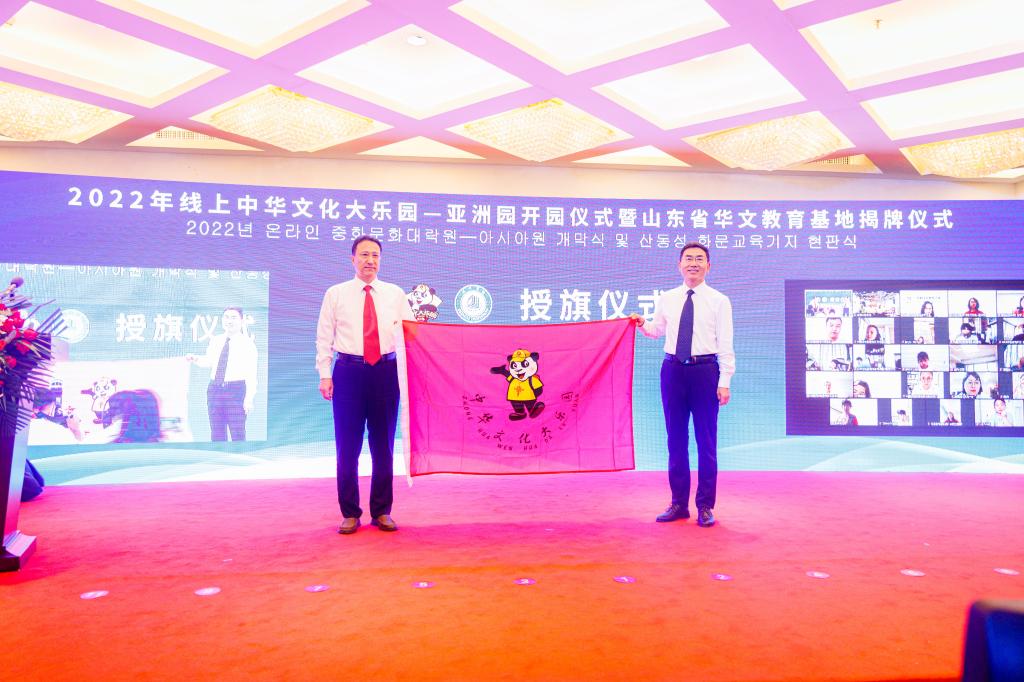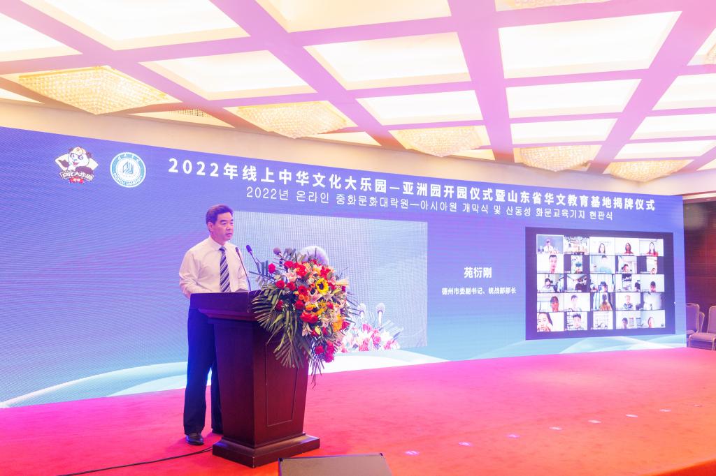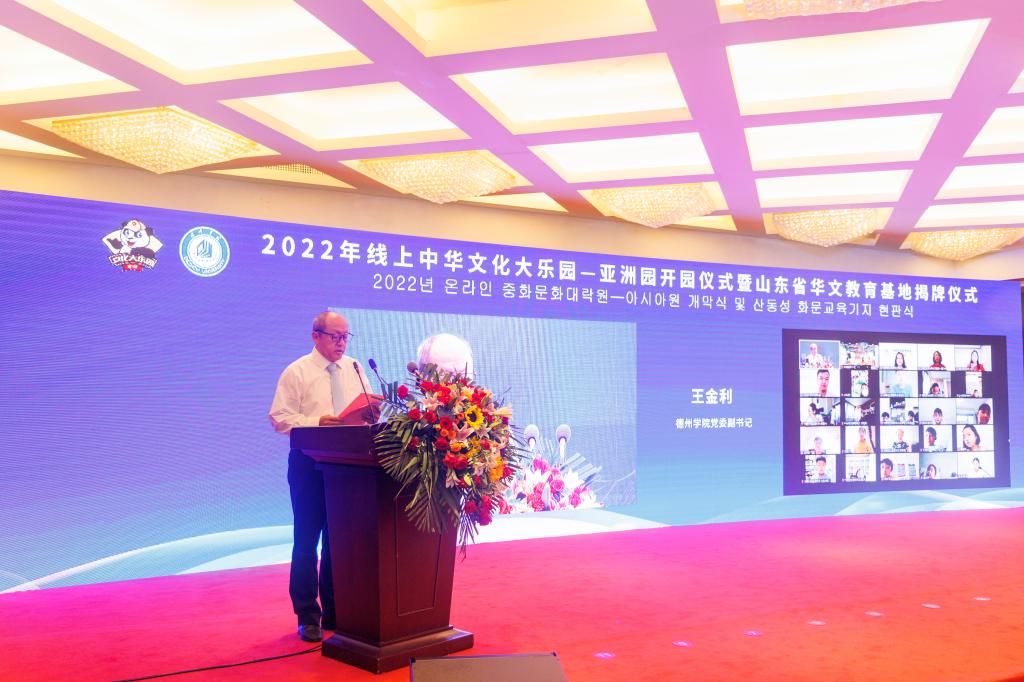 7月25日上午,2022年线上中华文化大乐园-亚洲园第十三期开园仪式暨山东省华文教育基地揭牌仪式在德州举行。本次活动由国务院侨务办公室主办,山东省人民政府侨务办公室、德州市人民政府侨务办公室、Beat365唯一官方网站共同承办。中国驻韩国光州总领事张承刚,韩国光州中国学校校长马玉春,省委统战部副部长、省侨办主任孙传尚,省委统战部八处处长、一级调研员王余良,德州市委副书记、统战部部长苑衍刚,Beat365官网党委副书记王金利,党委委员、副校长李永平出席开园仪式。