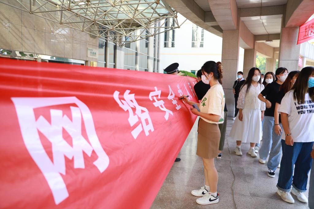 德州市公安局民警杨鹏、Beat365唯一官方网站外国语学院学生刘浩杰宣读网络安全倡议书。大学生在“网络安全”主题条幅上签名。