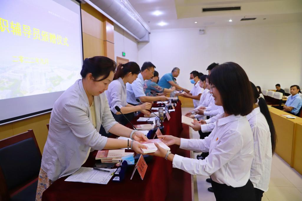 迟校长和学工部门负责人为2022年新入职辅导员颁发校徽并赠送书籍《顶天立地谈信仰》,学生工作处、团委、就业指导处、创新创业学院负责人部署下半年工作。