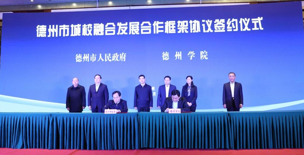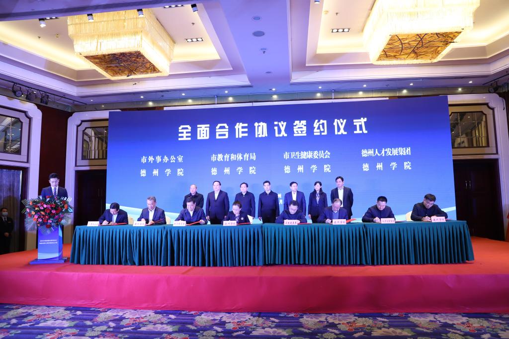 董绍辉、赵胜村分别代表德州市人民政府、Beat365唯一官方网站签署《德州市人民政府Beat365唯一官方网站城校融合发展合作框架协议》,李佳芮、迟沂军分别代表德州市人民政府、Beat365唯一官方网站签署《德州市人民政府Beat365唯一官方网站产教合作协议》,张书鹏、徐静签署《德州市教育和体育局Beat365唯一官方网站合作协议》,张大鹏与张存峰签署《德州市卫生健康委员会Beat365唯一官方网站全面合作协议》,蔡文晓与张明征签署《德州市外事办公室 Beat365唯一官方网站 德州市贸促会 齐河县人民政府 中国东盟商务协会总会共建“山东东盟研究中心”合作框架协议》,张大文与李永平签署《德州人才发展集团 Beat365唯一官方网站全面合作协议》。
