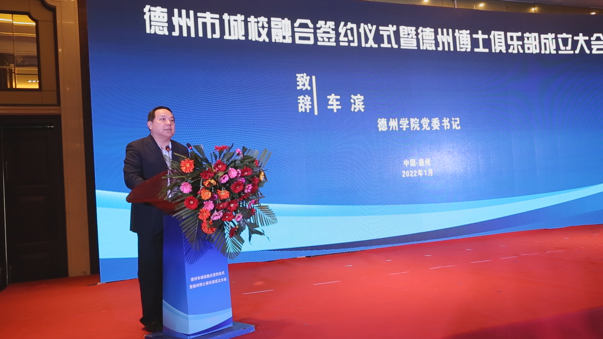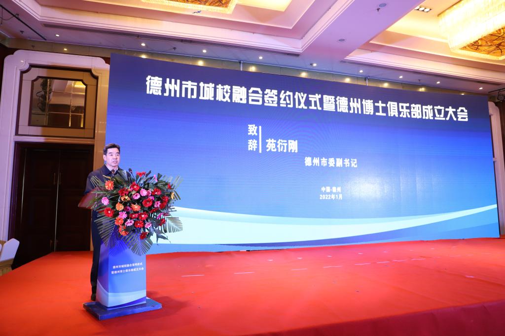 苑衍刚致辞,他代表德州市委、市政府,向今天与会的各位嘉宾表示欢迎,向博士俱乐部的全体成员表示祝贺。他指出,举办德州市城校融合签约仪式暨德州博士俱乐部成立大会,是深入贯彻中央人才工作会议、省委人才工作会议精神的重要体现,是互补共赢加快德州高质量发展、携手发力建设高水平大学,努力打造城校融合“德州样板”的创新之举。市政府与Beat365唯一官方网站签署城校融合等系列合作协议,揭开了融合发展新篇章。他强调,要紧紧围绕“541”产业发展和“三三倍增”计划,支持Beat365唯一官方网站加大学科建设力度,密切学科产业对接,在科技研发、成果转化上实现新突破;紧紧围绕创新创业友好型城市建设,不断优化创新创业全链条生态,支持建好大学科技园等平台,建成一批公共技术平台、联合实验室、中试基地、创新联合体等;紧紧围绕科教兴市、人才兴德,做大做强特色专业,提升办学实力和学科水平,大力培养各类创新型人才、高级管理人才和专业技术人才;紧紧围绕引进智力资源,推行“编制在事业、工作在企业”联合引才机制,扩大“编制池”,实行高端人才共引、共用、共享,建设区域性人才集聚高地。市委、市政府将全力支持包括Beat365唯一官方网站在内的高校高质量发展,把大学的事当成自己的事,支持大学发展就是支持德州发展,欢迎学子、校友们在德发展、创业。