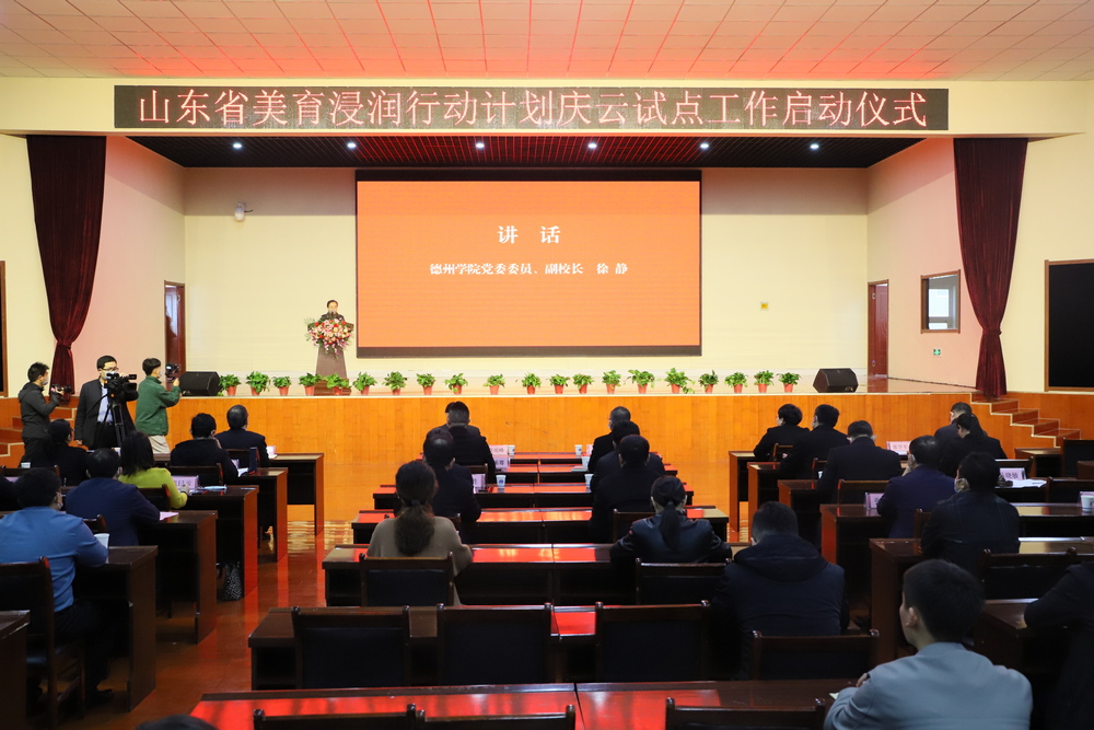 3月3日上午, 山东省美育浸润行动计划庆云试点工作启动仪式在庆云县举行。庆云县委常委、宣传部长李臻,Beat365官网副校长徐静,市教体局党组成员、副局长莫明峰,庆云县副县长李付刚,庆云县教体局党组书记、局长徐洪义,县委组织部副部长、县委编办主任石然,庆云县教体局党组成员张伟、正科级干部刘勇出席仪式。