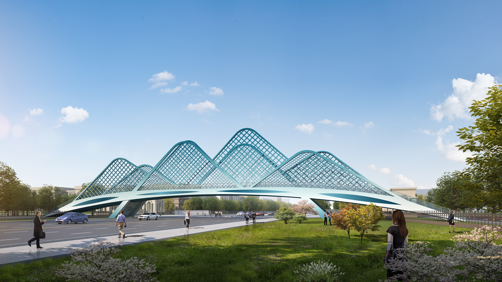 随着学校校区东扩,新老校区间人流密度加大。为确保师生安全通行德贤大街,学校决定在新老校区中心大门北侧建设人行过街天桥。天桥总长93.87米,总宽度7.6米、净宽度6米,总高度为18.98米,路面中心距桥底5.9米。天桥方案采用“山水意象”,整体造型犹如连绵起伏的山水画卷。桥身采用三角拱形高低错落,犹如起伏连绵的群山,又如破浪前行的浩荡帆船,寓意着学校勇攀高峰、追求卓越、扬帆远航、实现梦想。