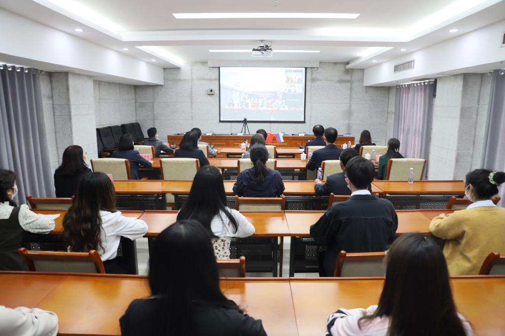 德州市外办相关人员,国际交流合作处、外国语学院、生命科学学院、经济管理学院相关负责人,外国语学院俄语系学生、生物技术、国际经济与贸易专业合作办学学生以及在校全体俄罗斯籍教师、留学生参加了会议。