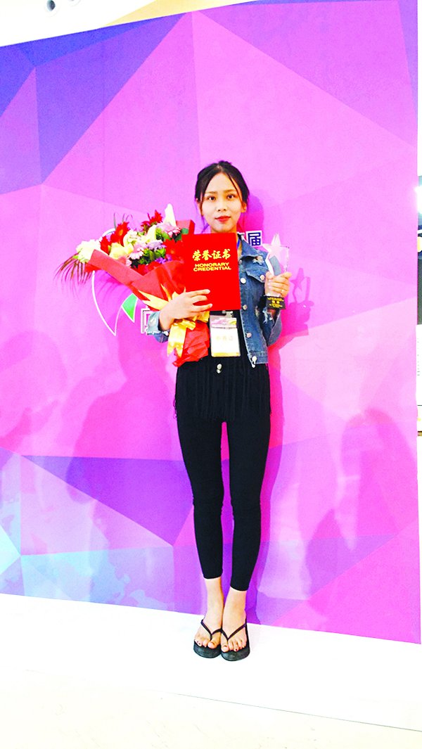 成绩:中共预备党员,获“山东省优秀学生”“技能能手”等荣誉称号。获2016年全国职业技能大赛服装设计与制作“全国金奖”,中国针织大赛银奖,山东省职业技能大赛服装设计“山东省一等奖”,2015年山东省职业院校技能大赛服装设计与工艺个人“山东省一等奖”等国家级、省市大奖30余项。获2015年国家技能英才奖学金、国家技高品端“一等奖学金”。2017年创业成立青岛新裁时装有限公司。