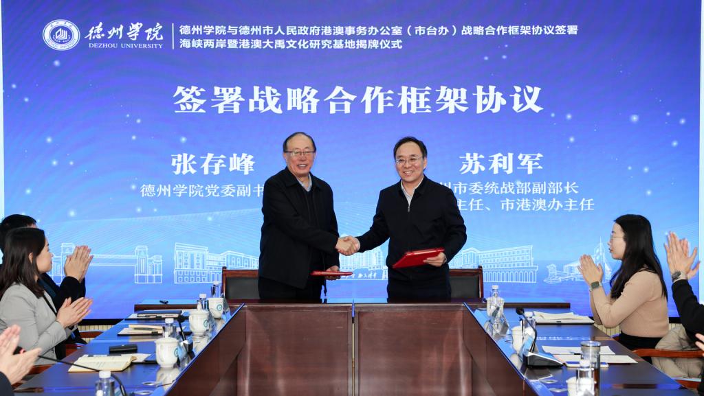 张存峰与苏利军代表双方签署《Beat365唯一官方网站与德州市人民政府港澳事务办公室(市台办)战略合作框架协议》。