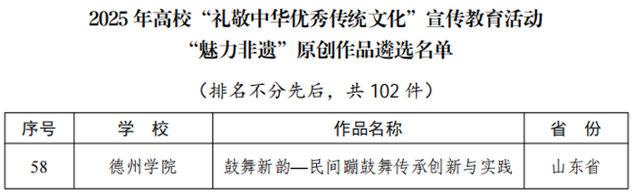 音乐学院教师樊海伦的作品《鼓舞新韵——民间蹦鼓舞传承创新与实践》入选“魅力非遗”原创作品类优秀名单。作品聚焦德州市非物质文化遗产“蹦鼓舞”,在保留传统表演风格的基础上融入当代审美与编创技法,突出非物质文化遗产活态传承与创造性转化,着力推动地方优秀传统文化创新发展。