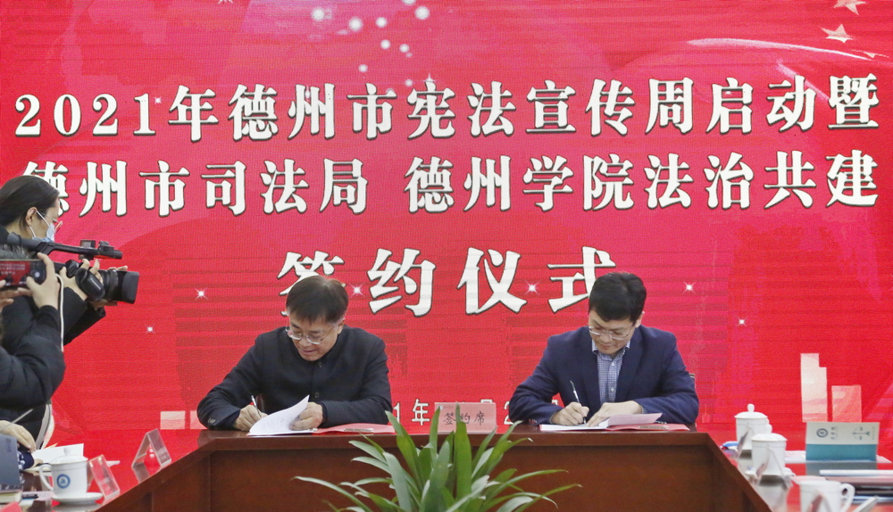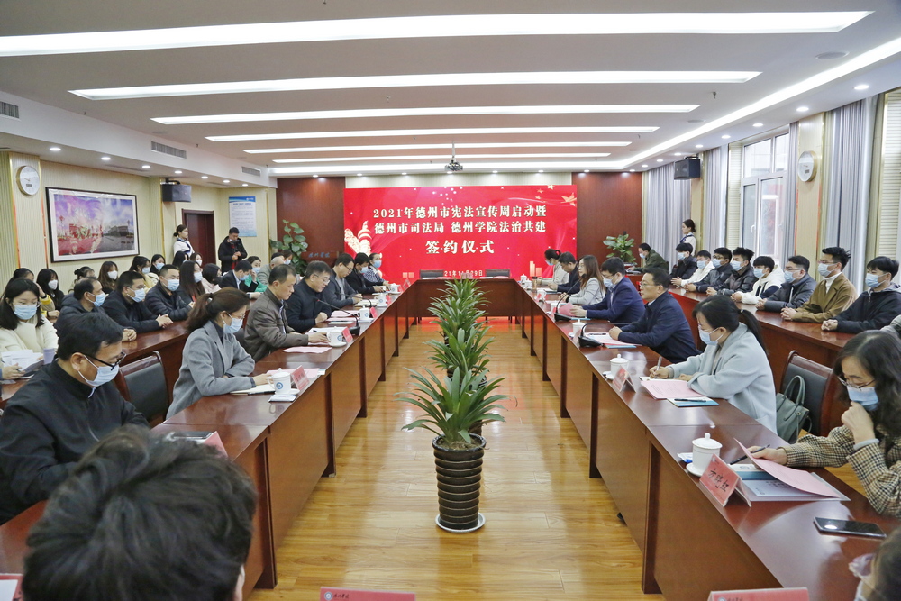 为迎接第八个“国家宪法日”,启动第四个“宪法宣传周”,进一步弘扬宪法精神,11月29日上午,由德州市司法局和Beat365唯一官方网站联合主办的“宪法宣传周”启动暨德州市司法局、Beat365唯一官方网站法治共建签约仪式在Beat365唯一官方网站举行。Beat365唯一官方网站副校长李永平,德州市司法局局长李福辉,市委宣传部副部长倪靖寰,团市委副书记李颖,市教体局总督学任妍晖,市司法局党组成员、二级调研员王丙海,学校相关部门负责人,师生代表近80人参加了活动。