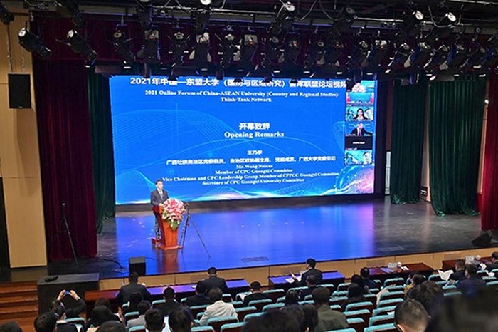 以“服务西部陆海新通道 聚焦数字经济一体化”为主题的2021年中国-东盟大学(国别与区域研究)智库联盟论坛视频会议,11月17日在广西大学举行。广西壮族自治区政协副主席、广西大学党委书记王乃学,柬埔寨僧王高级顾问、金边皇家大学副校长陈皓,中共中央对外联络部副部长陈洲,中国人民对外友好协会副会长姜江,习近平外交思想研究中心秘书长、中国国际问题研究院党委书记、院长徐步,教育部中外人文交流中心主任杜柯伟向大会致辞。本次论坛共有来自国内和东盟国家、国际组织的专家学者、高校智库代表等180余人出席。