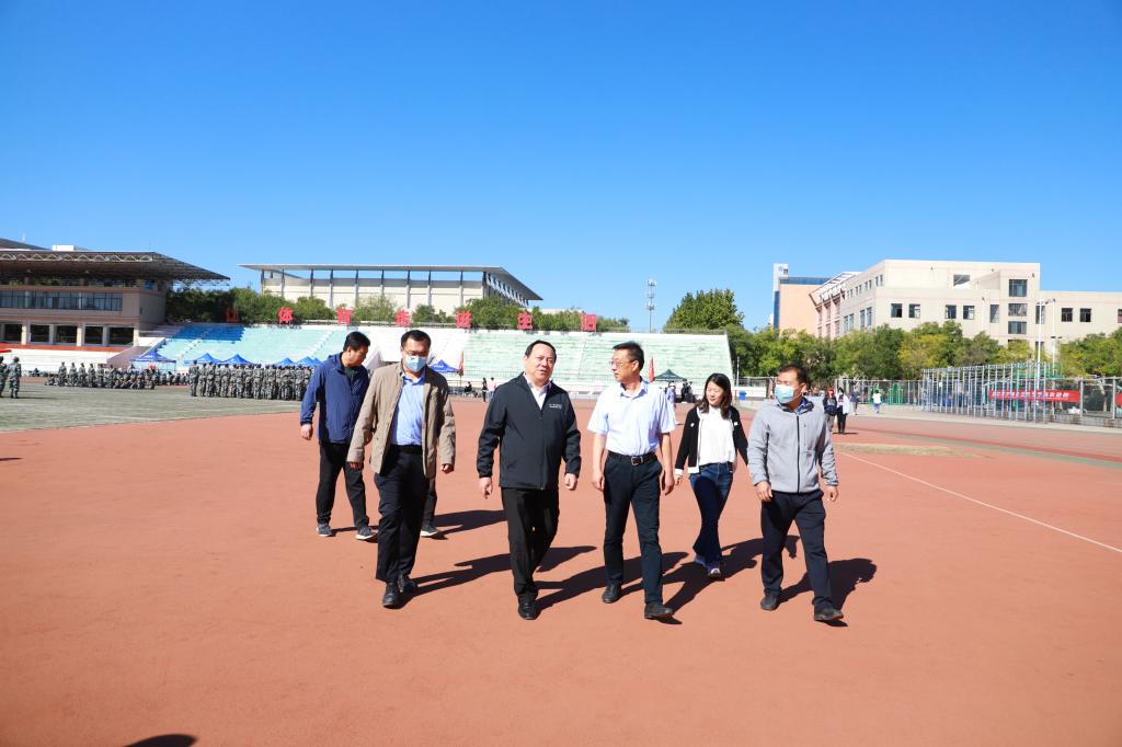 9月23日,晴空万里,碧空如洗,在军训训练场地,参训学生队列整齐、口号嘹亮。党委书记车滨,党委委员、副校长迟沂军,党委委员、副校长徐静来到2022级新生军训现场,检查指导军训工作并看望慰问参训人员。