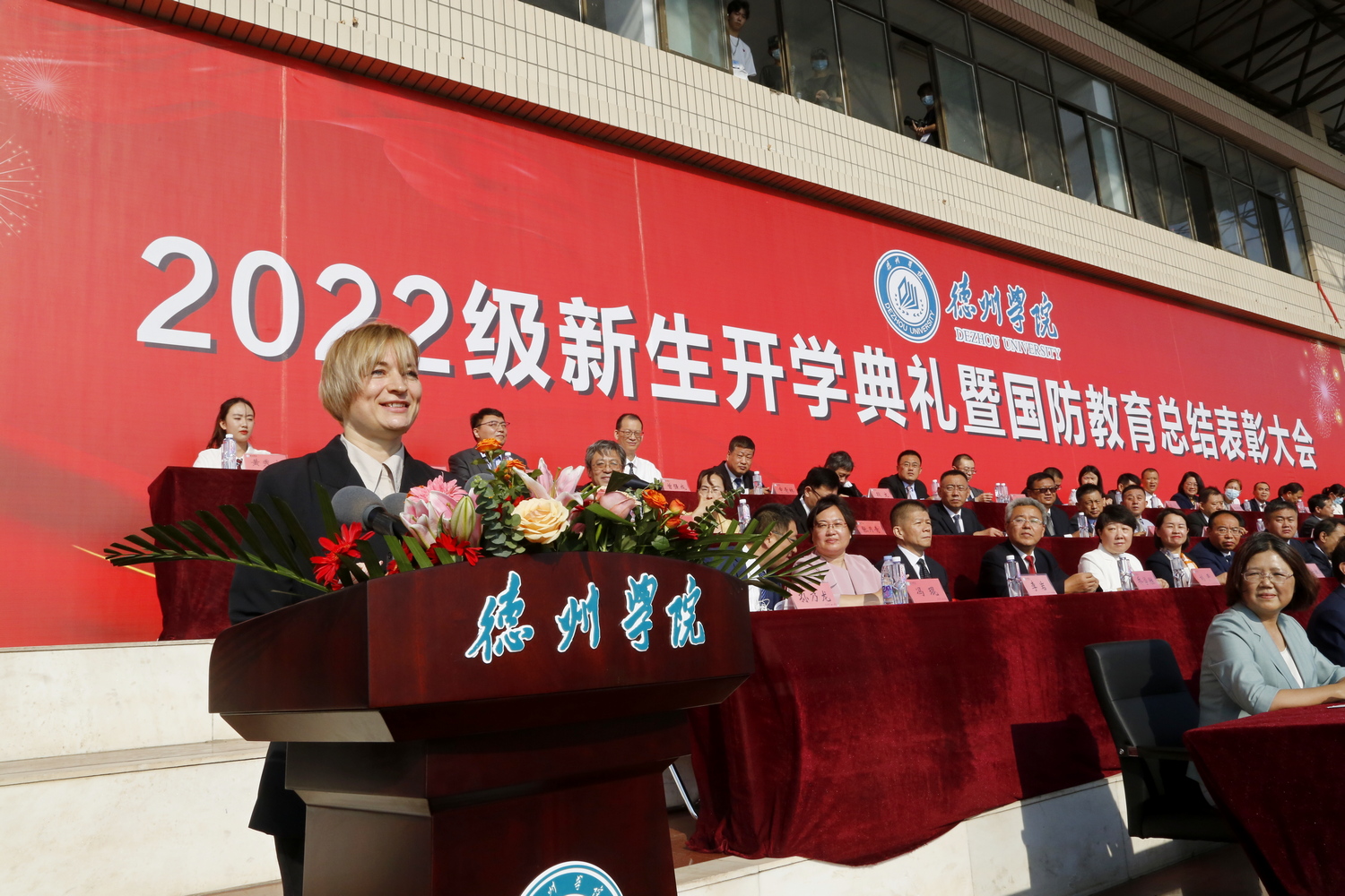 在校生代表2019级物理与电子信息学院许世纪同学代表老生对新同学表示欢迎,他分享人生感悟与学弟学妹们共勉。他说,要下得苦功夫,求得真学问,要融入集体,塑造全新自我,并且要高瞻远瞩,奠基美好人生。生逢盛世,重任在肩,大家要争得属于我们自己的成就和荣光。此刻的我们以身为德院学子为荣,明天德院必将以我们为傲。