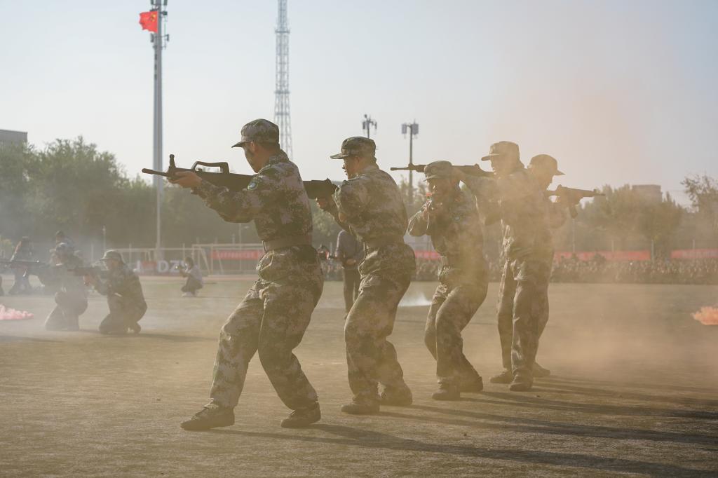 分列式后,进行了精彩表演。灵活多变的方阵表演,向祖国表白,发出青春最强音;干净利落、整齐划一的擒敌拳引得新生连连称赞;英姿飒爽、气势恢宏的匕首操锻炼了吃苦不懈怠的意志品质;节奏明快、赏心悦目的旗语操一登场便火爆全场;战术演练突出实景,培养学生自主能力、应变能力……