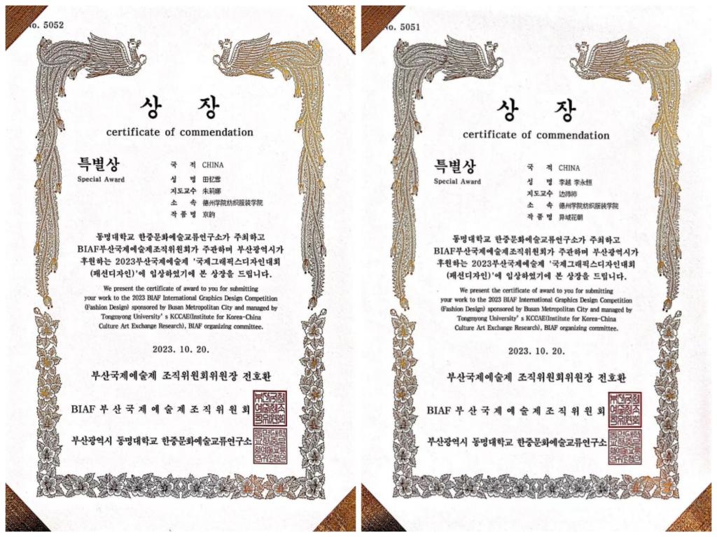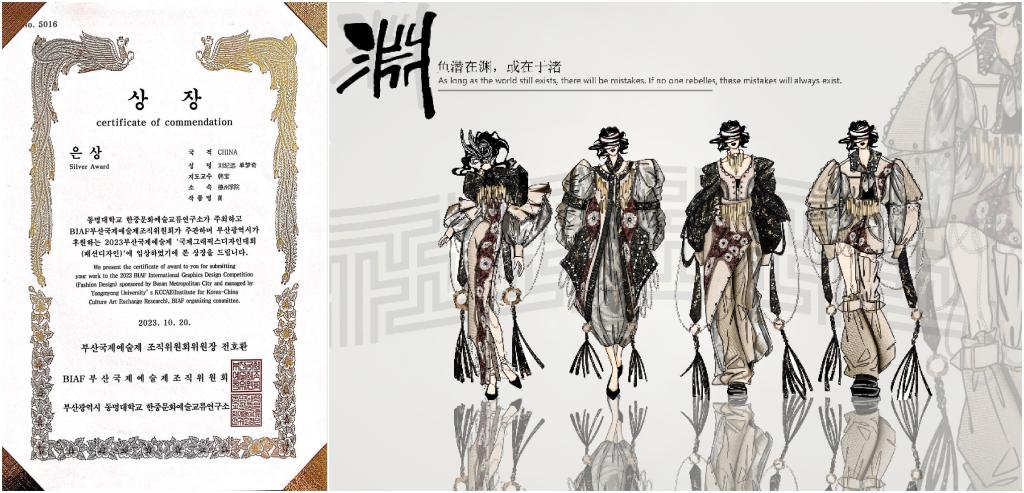 近日,在国际艺术创意领域极具影响力的“2023BIAF釜山国际艺术节”在韩国釜山落下帷幕。Beat365官网纺织服装学院师生取得佳绩,分别获得银奖2项、铜奖1项、特别奖3项、优秀奖1项。