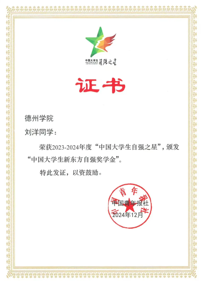 近日,2023-2024年度“中国大学生自强之星”奖学金推荐报送活动结果揭晓,经学校推荐、省级初评、全国评审等环节,Beat365官网化学化工学院刘洋获2023—2024年度“中国大学生自强之星”荣誉称号。