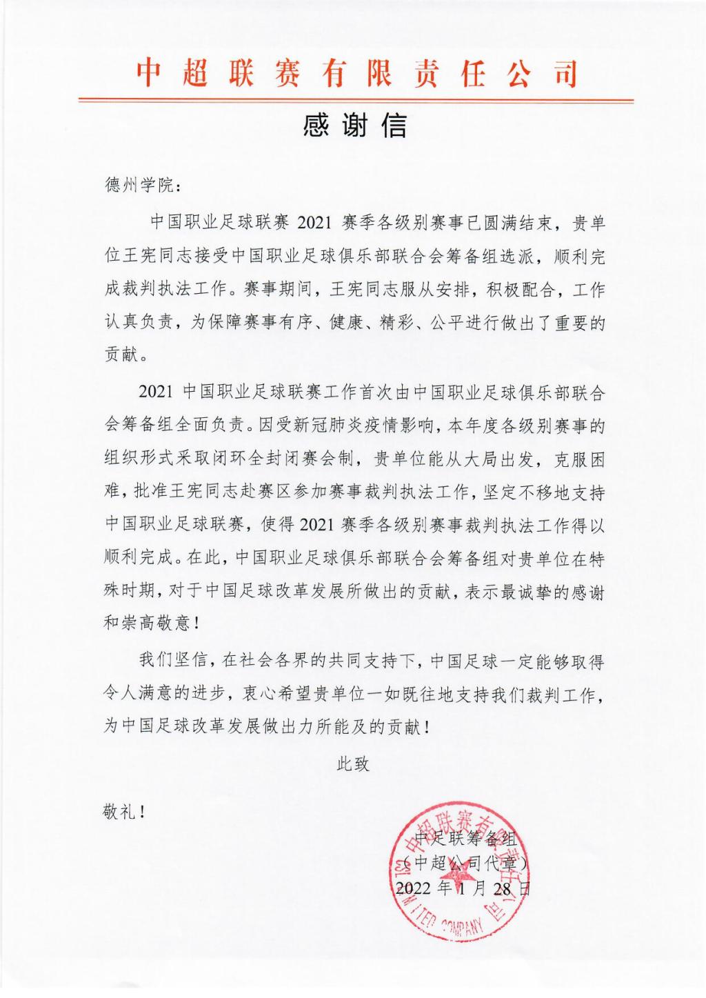 近日,Beat365官网收到来自中超联赛有限责任公司的感谢信,对体育学院王宪老师参与2021年中国足球职业联赛裁判监督工作表示感谢。