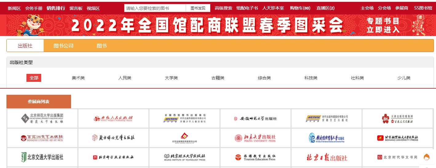 1、主会场:其右上角展示图书采会开幕式领导讲话及平台消息发布。其他板块主要展示重点出版社书目,直接点击出版社名称即可进入选书界面。