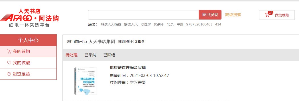 5、我的荐购:【个人中心】→【我的荐购】 中可查看到所有的荐购书目,及图书馆的采纳情况。