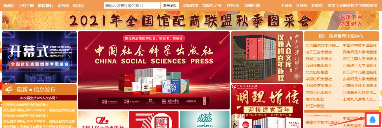 1、主会场:其左上角展示领导讲话及平台消息发布。其他板块主要展示重点出版社书目,直接点击出版社名称即可进入选书界面。