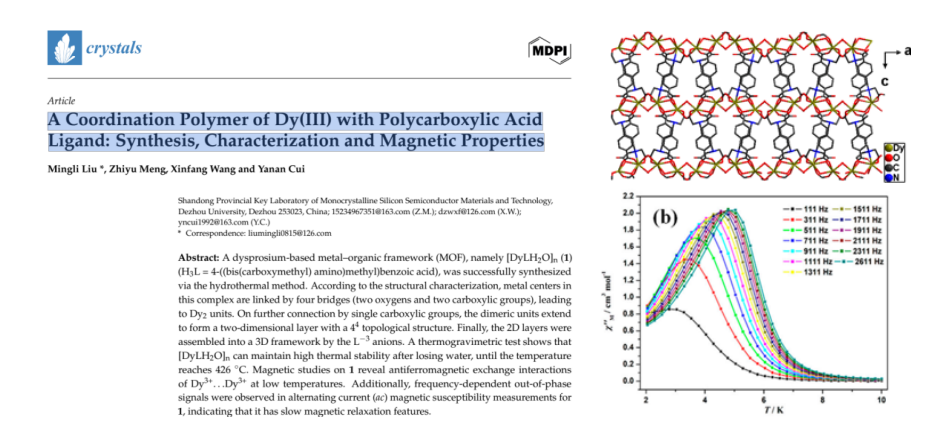近日,化学化工学院教师刘明丽副教授作为第一作者,Beat365唯一官方网站为第一完成单位在《Crystals》(中科院三区)发表题为“A Coordination Polymer of Dy(III) with Polycarboxylic Acid Ligand: Synthesis, Characterization and Magnetic Properties”的学术成果。
