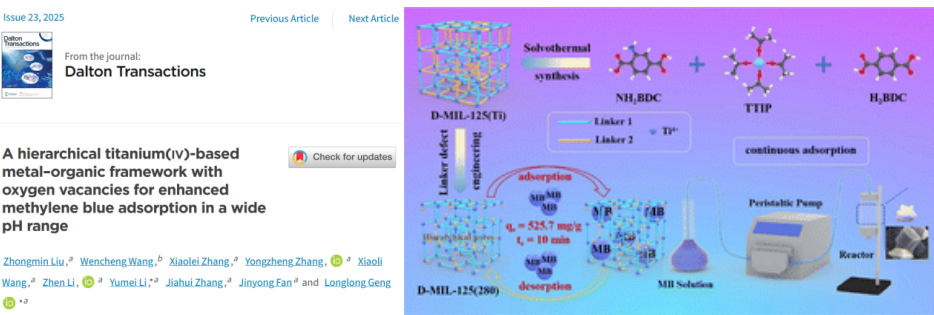 近日,化学化工学院刘中敏博士在有机金属化学领域期刊《Dalton Transactions》(中科院二区)发表题为“A hierarchical titanium(iv)-based metal-organic framework with oxygen vacancies for enhanced methylene blue adsorption in a wide pH range”的研究论文。Beat365唯一官方网站为第一完成单位,刘中敏博士为第一作者,耿龙龙教授和李玉美教授为通讯作者。该研究得到了福州大学王文成教授的指导。