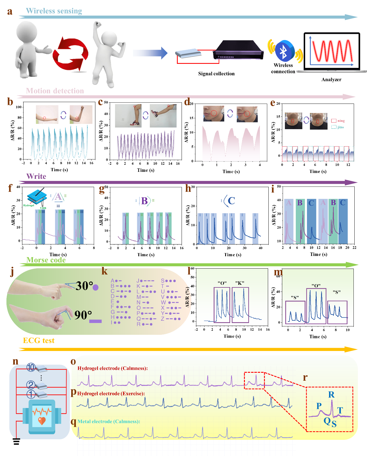 图2 水凝胶在人体运动监测、语音识别和心电图监测等方面的应用。