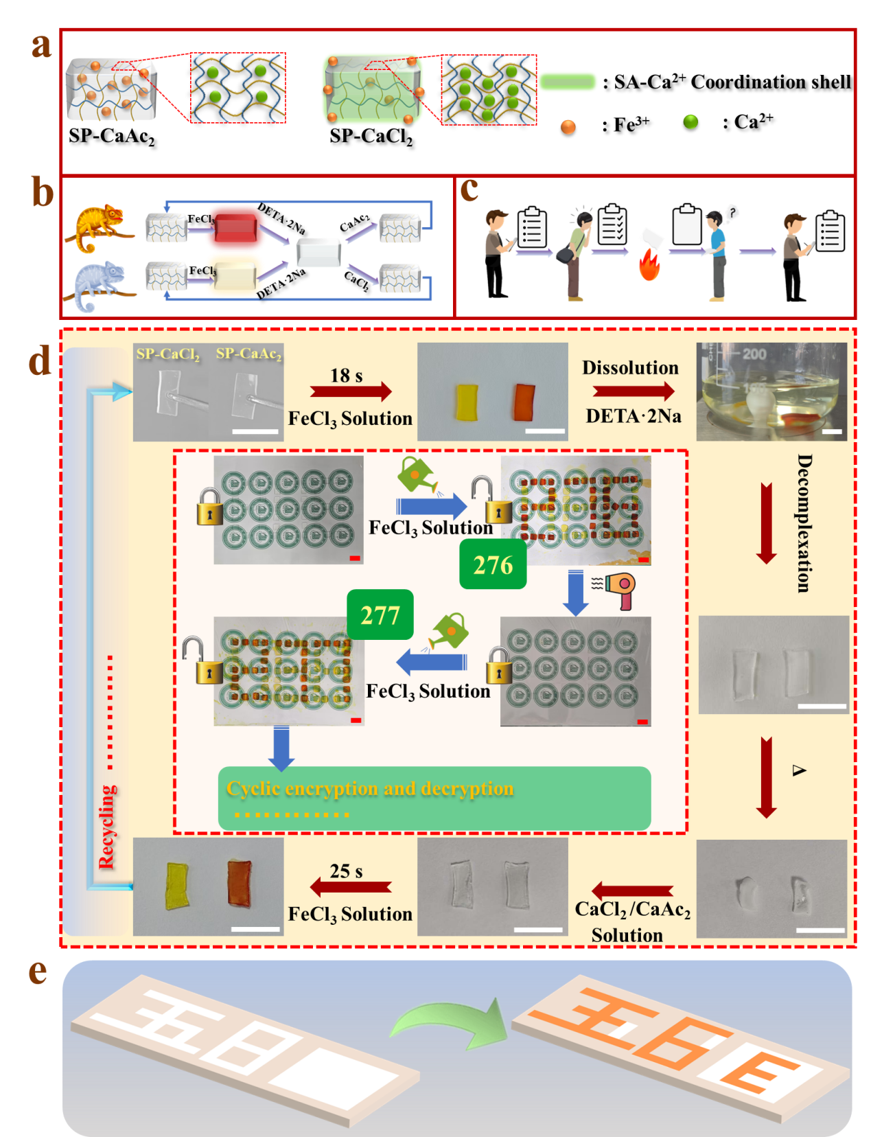 研究团队进一步挖掘Fe³⁺/Ca²⁺置换速率差异,开发出时间编程加密技术。实验显示,CaAc₂型水凝胶在FeCl₃溶液中18秒即可均匀显色,而CaCl₂型因致密表层仅显浅黄色,这种时空差异成功实现了“动态加密-定时解密”功能。该材料已成功应用于心电监测、手势识别等可穿戴场景,并构建了输出电压达63.7V的摩擦纳米发电机。
