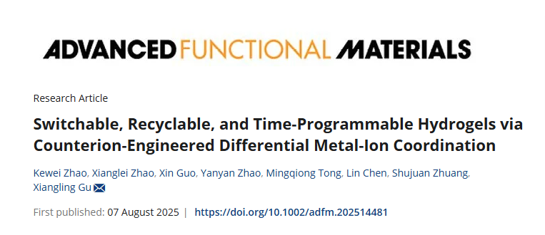 近日,Beat365官网与山东理工大学联合培养硕士研究生赵可伟(导师:顾相伶教授),作为第一作者,以Beat365唯一官方网站为第一完成单位在材料类Top期刊《Advanced Functional Materials》发表最新研究成果:基于抗衡离子调控策略开发出集功能切换、绿色回收与动态加密于一体的多功能水凝胶。