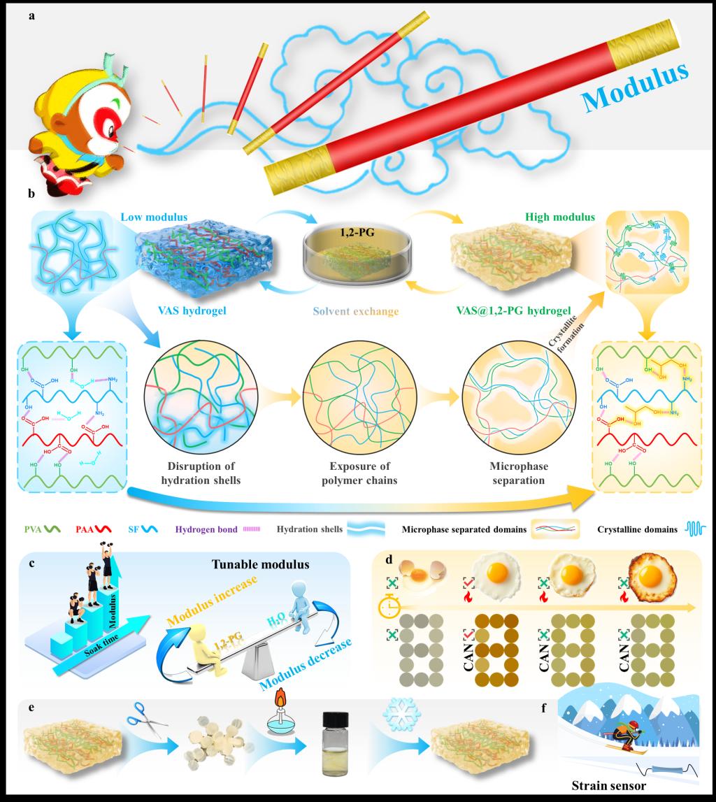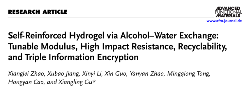 近日,该团队提出了一种“醇析效应”的新思路,通过醇-水置换制备了自增强水凝胶,实现了水凝胶新材料的模量可调、高抗冲、可回收以及三重信息加密。将水凝胶浸泡于1,2-丙二醇(1,2-PG)中,调控浸泡时间实现了模量从kPa至MPa的精准调节。通过溶剂置换诱导聚合物链形成纳米级微晶域和多重氢键网络,有效增强了材料的力学性能。置换后的水凝胶展现出卓越的强韧性与抗冲击性能以及优异的抗冻性。此外,所设计的材料可实现模量的“高-低”循环调控,具有良好的可回收性能,契合绿色材料的设计理念。研究团队使用硝酸铈铵溶液,开发了时间/紫外/温度三重响应的集成防伪新方法,用于动态信息隐藏与“阅后即焚”式加密显示。该工作以Beat365官网与济南大学联合培养硕士研究生赵相磊作为第一作者,顾相伶教授为通讯作者,10月27日以“Self-Reinforced Hydrogel via Alcohol-Water Exchange: Tunable Modulus, High Impact Resistance, Recyclability, and Triple Information Encryption”为题在线发表(Xiangling Gu*, et al, Adv. Funct. Mate., 2025, e23269)。
