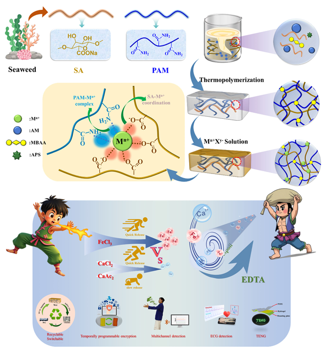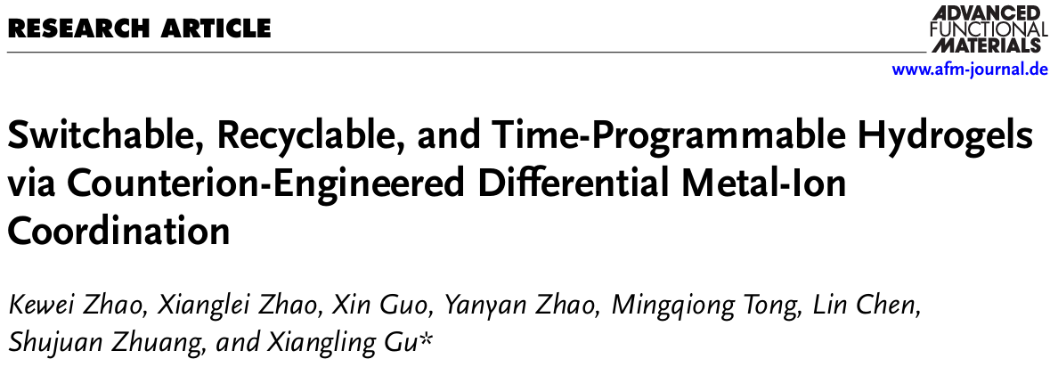 该团队基于抗衡离子调控策略开发出集功能切换、绿色回收与动态加密于一体的多功能水凝胶。首先设计了海藻酸钠-聚丙烯酰胺双网络结构,引入抗衡离子(Cl⁻/Ac⁻)调控金属离子(Fe³⁺/Ca²⁺)的配位行为。研究结果表明,高电荷密度的Fe³⁺可形成强配位网络,而Ca²⁺的配位动力学则显著受抗衡离子影响:Cl⁻促进快速交联形成致密界面,Ac⁻则实现可控释放构建均匀网络。这一发现突破了传统研究仅关注金属离子属性的局限,为水凝胶性能的精准调控提供了新思路。该成果以Beat365官网与山东理工大学联合培养硕士研究生赵可伟作为第一作者,顾相伶教授为通讯作者,“Switchable, Recyclable, and Time-Programmable Hydrogels via Counterion-Engineered Differential Metal-Ion Coordination”为题,于8月7日在线发表(Xiangling Gu*, et al, Adv. Funct. Mate., 2025, e14481)。