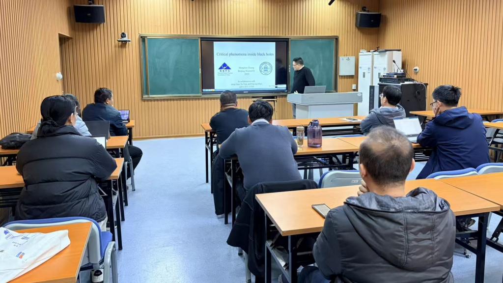 张教授以《黑洞内部的临界现象》为题作了精彩学术报告。黑洞作为爱因斯坦广义相对论最美丽的预言之一,不仅在人们理解各种天体物理学现象方面发挥着至关重要的作用,而且为研究者了解时空和量子引力的基本性质提供了宝贵的线索。张宏宝报告了其在r=0奇点形成阈值处黑洞内部临界现象的最新数值研究。此研究类似于1993年由Choptuik发现的黑洞视界形成阈值处的著名临界现象。在讨论环节,张宏宝与在场老师讨论了奇点的相关问题,深入解释了临界现象的物理意义,并就如何高效撰写科研项目申请进行了深入交流。