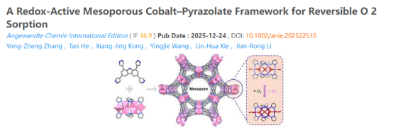 近期,化学化工学院张永正副教授作为第一作者在化学类顶级期刊《Angew. Chem. Int. Ed.》(中科院一区,ESI化学学科TOP期刊,IF:16.9)上发表了题为 “A Redox-Active Mesoporous Cobalt–Pyrazolate Framework for Reversible O₂ Sorption” 的研究论文,北京工业大学李建荣和何涛教授作为通讯作者。