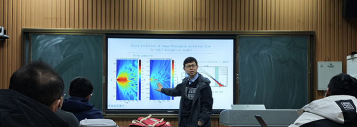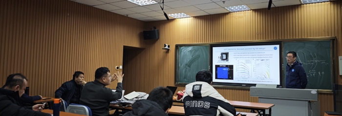 乔二林研究员系统阐述了黑洞潮汐瓦解事件(TDE) 这一时域天文学的前沿课题。他从观测现象入手,深入剖析了恒星被黑洞潮汐力撕裂、物质吸积并产生剧烈辐射的全过程物理机制,并重点分享了其团队在超爱丁顿吸积过程的理论建模与数值模拟方面的最新研究进展。乔研究员的报告逻辑清晰、深入浅出,为听众理解黑洞周围极端环境下的物质行为打开了新的窗口。