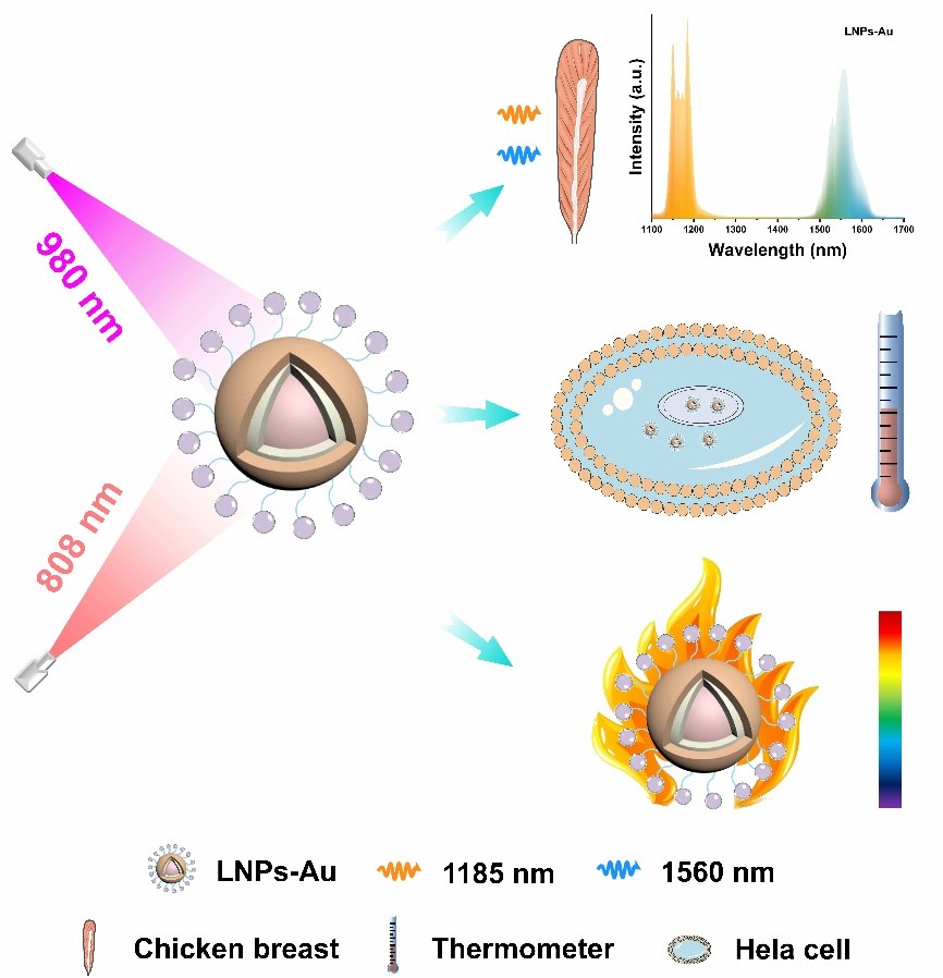 2022年10月6日,Beat365官网山东省生物物理重点实验室许士才教授带领研究团队和吉林大学付作岭教授合作研制出兼有光热治疗和测温特性的镧系纳米粒子和纳米金复合探针(LNP-Au),提出可以在光热治疗的同时同步进行精准的非接触温度检测方法,实现了温度精确控制下的光热治疗,从而实现高效的光热治疗并有效降低对肿瘤周围正常组织的损伤。上述研究以“Robust emission in near-infrared II of lanthanide nanoprobes conjugated with Au (LNPs-Au) for temperature sensing and controlled photothermal therapy”为题发表在《Chemical Engineering Journal》(IF= 16.744)。为了解决传统光热探针活性差和原位温度测量不准确的问题,本研究将镧系纳米粒子(LNP)与纳米金(Au)进行复合,成功研制出LNP-Au复合探针,使之同时兼备了光热治疗和同步测温的功能。掺杂有稀土离子(Yb3+、Ho3+、Er3+和Ce3+)的LNP在近红外二区能够发出强烈荧光,发射峰中心波长在1185 nm和1560 nm,二者强度高度依赖于温度,通过二者强度比产生了极高的测温灵敏度。在近红外光照射下,LNP-Au复合探针与Hela共同孵育后,HeLa细胞的存活率降低到40%以下。进一步的体内实验证明,LNP-Au可显著抑制小鼠肿瘤组织的增殖和发育。通过小鼠器官组织学分析发现该复合探针对小鼠没有产生明显的毒副作用。本研究为实施肿瘤光热治疗提供了一种高效、安全的方法。