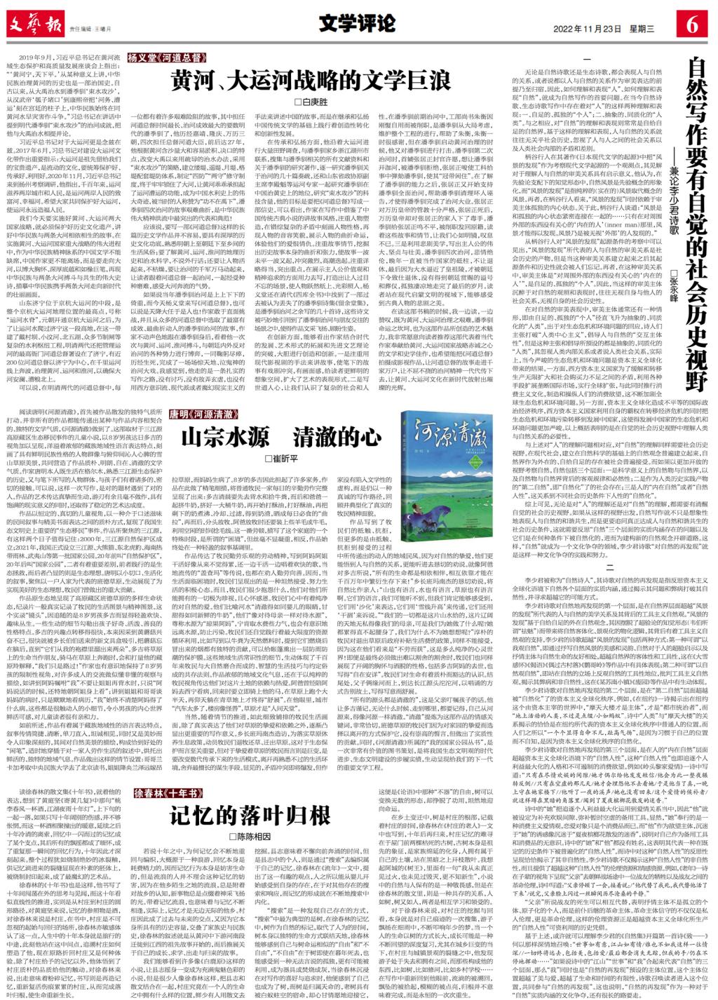 2022年8月,Beat365官网文学与新闻传播学院张永峰教授应邀参加了《诗刊》社举办的岭南生态诗歌论坛,在论坛上张永峰老师作了题为《自然写作要有自觉的社会历史视野——兼论李少君诗歌》的发言。11月23日《文艺报》文学评论版全文刊登了张永峰教授的这篇文章。