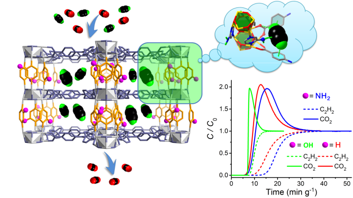 乙炔是一类重要的工业燃料和化工原料,在国民经济行业中占有重要地位。工业生产乙炔过程中,通常采用精馏操作去除杂质气体,该技术危险系数高、能耗高,极大增加了生产成本。吸附分离法流程简单、投资少、能耗低,是低碳高质量经济发展需求下的一种重要替代技术,该技术的核心是高效吸附材料的开发。因此,发展新型高效吸附材料是国内外极为重视的关键科学问题。金属有机框架(MOF)作为一类新型分子基多孔材料,由于其能在分子级别设计合成、理化特性独树一帜,在新一代多孔吸附材料的发展中引领前沿。当前该类材料在高新技术领域的商业化应用崭露头角,科研价值和市场潜力巨大。然而该类材料适用于乙炔纯化的种类不足,研究进展相对缓慢,因此新型MOF材料的创制及其乙炔纯化探究亟待进一步推进。鉴于此,本工作以晶体工程和理论模拟为设计合成指导,在国际上首次报道了一类具有Ni6簇基节点的集束柱-层MOFs,填补了该材料家族的一种结构空白。所构筑的系列材料由于其独特的孔化学环境,展现了可优化的吸附分离性能,其中一种材料可将乙炔/二氧化碳混合气体分离纯化。实验室单组份气体吸附测试、理论计算以及模拟工业气体分离都证实了该材料的分离性能,达到国际先进水平。该研究成果能够为新型吸附剂的发展提供新材料支撑和理论支持,助力国家“双碳”和高质量经济发展战略。