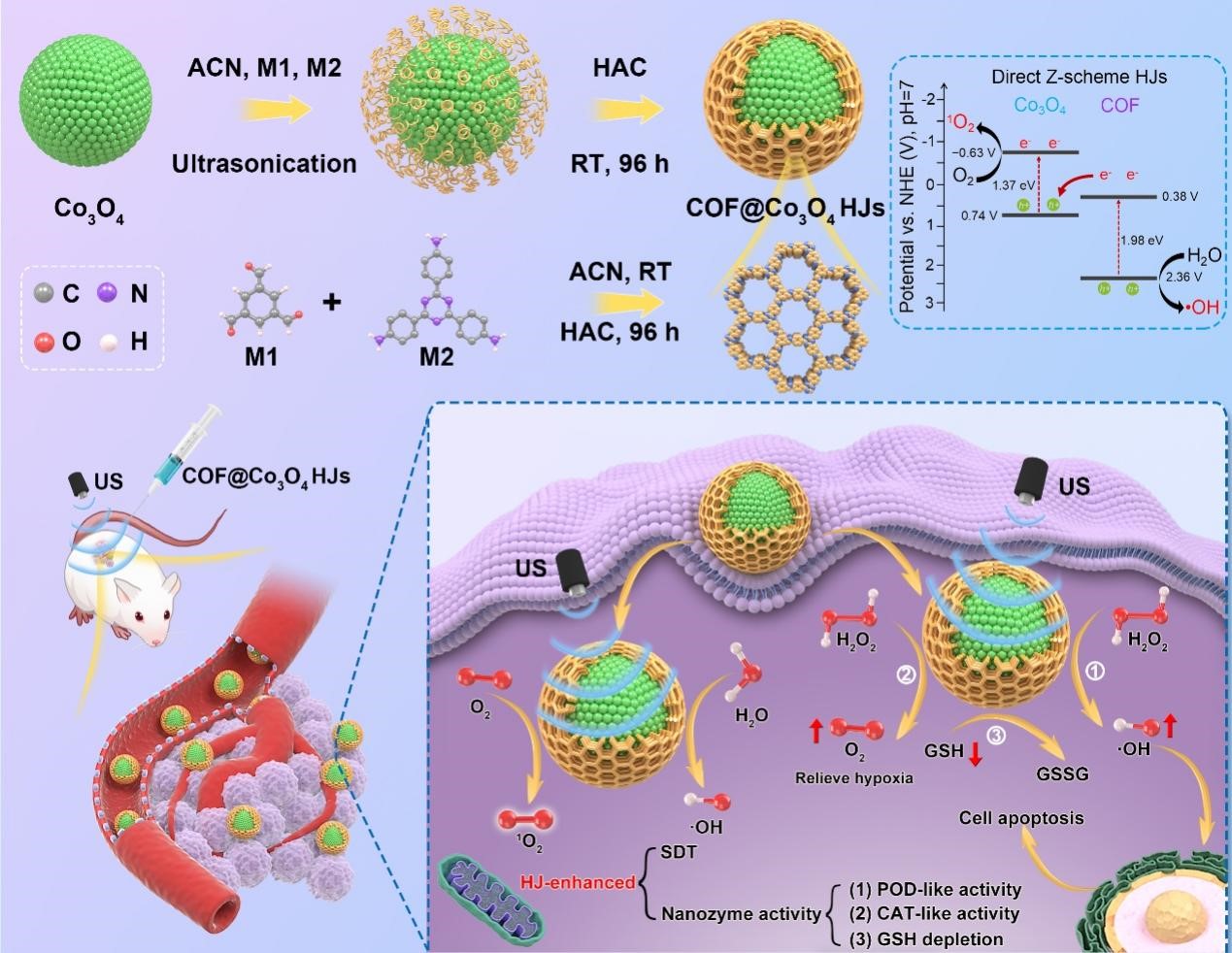 基于此,化学化工学院冯传起博士与上海大学、第二军医大学等单位合作构建了一种新型的COF@Co3O4 Z-型异质结纳米酶平台以增强纳米催化-声动力联合肿瘤治疗的效果。所制备的Co3O4纳米球不仅具有优异的声动力学性能,而且还兼具类过氧化物酶、过氧化氢酶和谷胱甘肽过氧化物酶的催化活性,可以实现ROS的扩增,缓解肿瘤缺氧问题。更重要的是,超声(US)触发的Co3O4纳米球的ROS产生能力和三重酶模拟活性可通过COF@Co3O4 Z-型异质结的构筑大大增强。基于改进的US产生的电子-空穴对的空间分离动力学和加速的载体转移过程,COF@Co3O4实现了无复发的完全肿瘤根除。该工作为设计高效纳米酶平台用于增强肿瘤治疗效果提供了有价值的思路与方案。