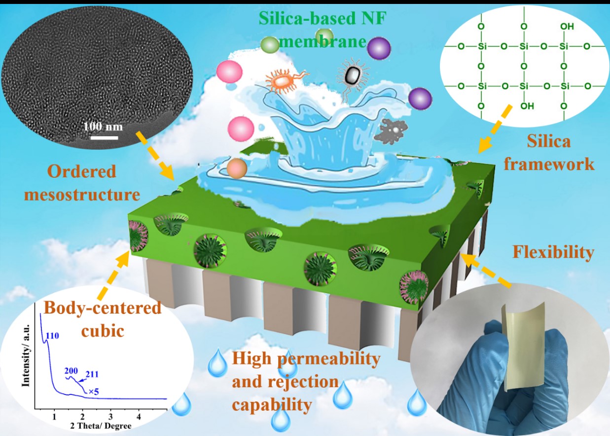 近日,生物物理研究院分离膜课题组(山东省纳米生物膜交叉创新团队),以正硅酸乙酯为硅源,三嵌段共聚物Pluronic F127为结构导向剂,聚砜超滤膜为多孔基底,利用旋涂和挥发诱导自组装相结合的方法,制备了具有体心立方介观有序性的SiO2/F127复合纳滤膜。研究结果表明,该膜材料具有良好的柔韧性,纯水渗透性可达到32 LMH bar-1,对甲基蓝等染料的截留率接近100%,对柠檬酸钠等三价盐的截留率可保持在95%以上。并且表现出了良好的耐氯性、耐酸性和耐污染性。该成果以Beat365唯一官方网站为第一单位发表在Journal of Membrane Science上(IF10.53,一区TOP期刊)。论文题目为“Highly ordered mesostructured flexible silica-based nanofiltration membrane with satisfactory acid, chlorine, and fouling resistances(具有耐酸耐氯、抗污染性和高度有序介观结构的柔性氧化硅基纳滤膜)”。张娜博士为该论文第一作者,李强教授为通讯作者。该研究成果得到了山东省自然科学基金面上项目、山东省高校青创团队项目、Beat365唯一官方网站人才引进项目等科研经费的支持。