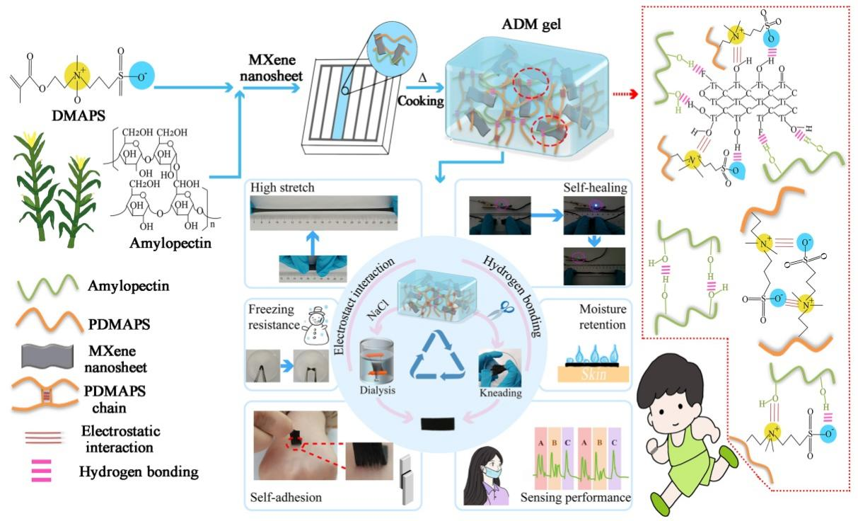 基于上述问题,化学化工学院胡若飞博士及其合作者以淀粉为基体开展了深入的研究。淀粉具有大量的羟基基团,能够形成氢键网络,然而,其力学性能仍然不够理想。为此,以两性离子聚合在凝胶体系之间形成第二网络,两性离子之间能形成静电相互作用,再以纳米离子增强可逆相互作用。受益于静电作用、氢键构建的可逆非共价交联网络,得到的淀粉基凝胶显示出了优异的力学性能、快速自修复性能,优异的耐低温性能和黏附性能。该凝胶能够直接应用为柔性器件,在低温条件下或者剪断修复之后,仍具有原有性能。此外,该淀粉基凝胶还可以在能量存储器件中作为固态电解质,由此编制的电容器显示出良好的比电容。在多重优异性能基础上,从环境保护和资源利用角度出发,实现其回收利用是目前面临的难题。由于淀粉是该凝胶的主要成分,因此,其能通过类似于揉捏面团的方式实现回收再利用。该凝胶还可以在离子溶液中溶解,经透析实现回收再利用。这项工作为设计可回收的多功能性聚合物提供了一种建设的思路。